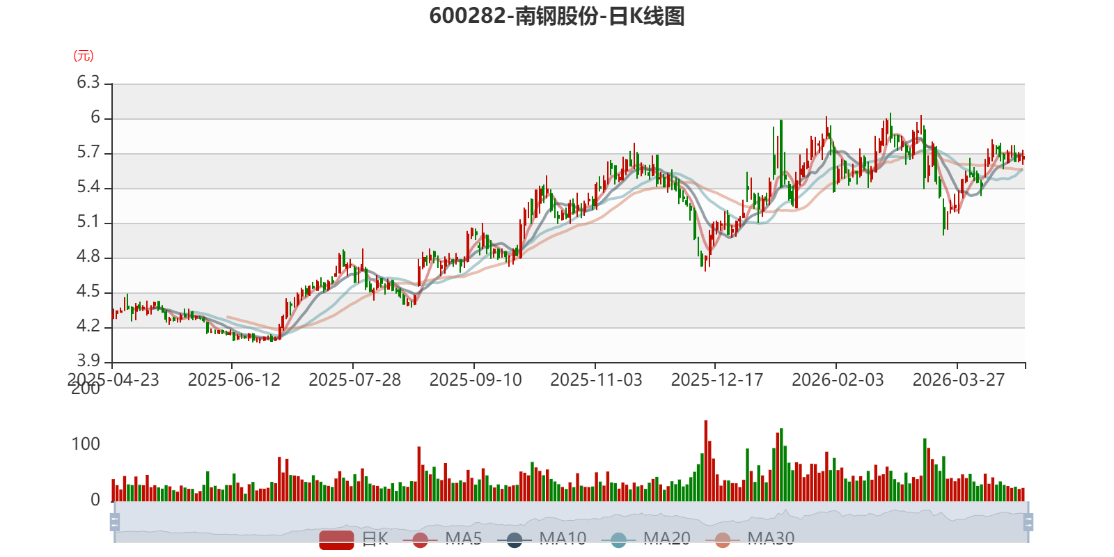 中证智能财讯南钢股份(600282)4月23日披露2026年第一季度报告。公司实现营业总收入144.14亿元,同比增长0.42%;归母净利润5.97亿元,同比增长3.23%;扣非净利润4.31亿元,同比下降13.62%;经营活动产生的现金流量净额为7.15亿元,同比下降5.57%;报告期内,南钢股份基本每股收益为0.0969元,加权平均净资产收益率为2.13%。