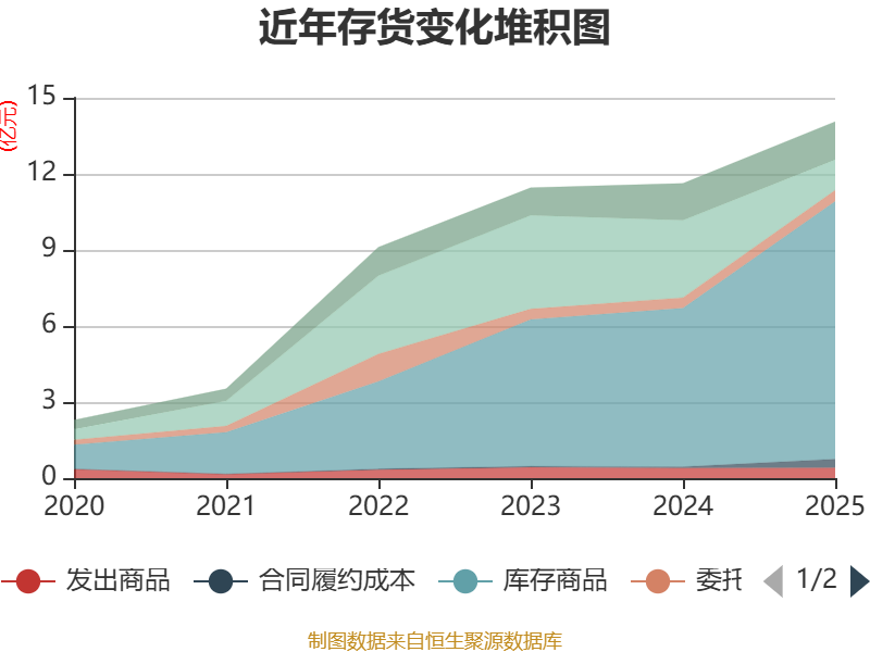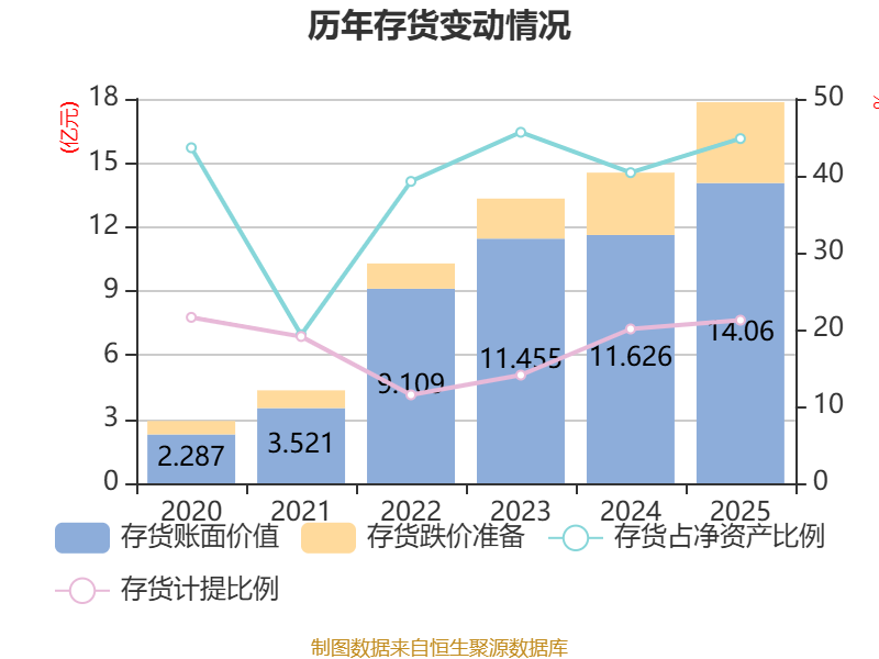从存货变动来看,截至2025年末,公司存货账面价值为14.06亿元,占净资产的44.83%,较上年末增加2.43亿元。其中,存货跌价准备为3.78亿元,计提比例为21.21%。