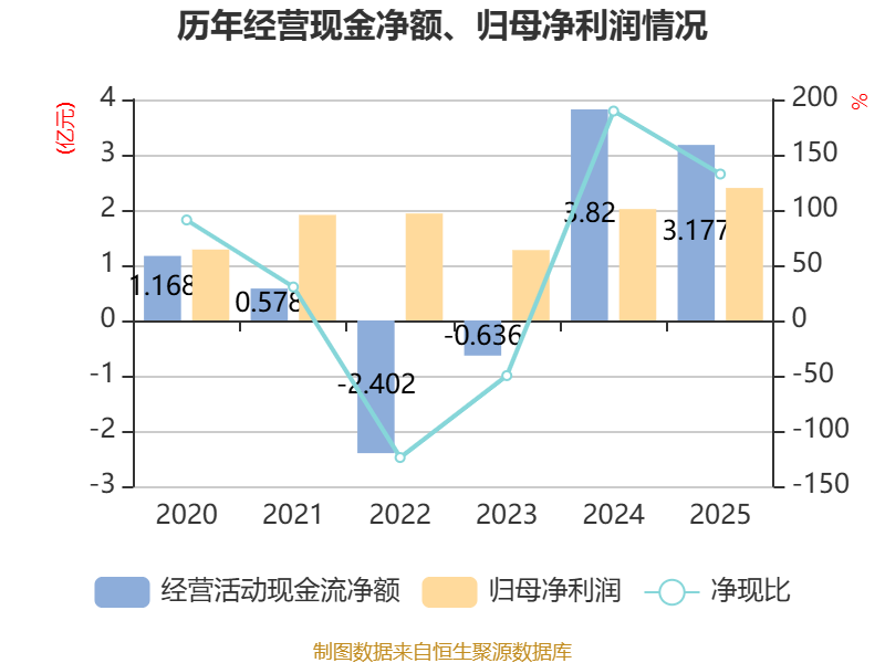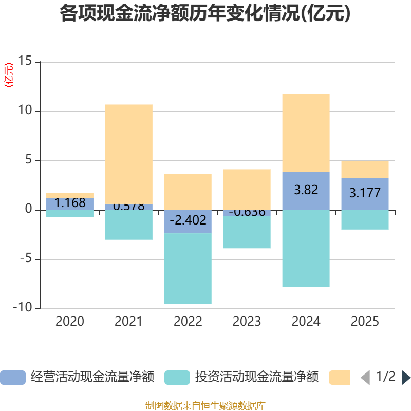 截至2025年,公司经营活动现金流净额为3.18亿元,同比下降16.81%;筹资活动现金流净额1.77亿元,同比减少6.14亿元;投资活动现金流净额-2.02亿元,上年同期为-7.84亿元。