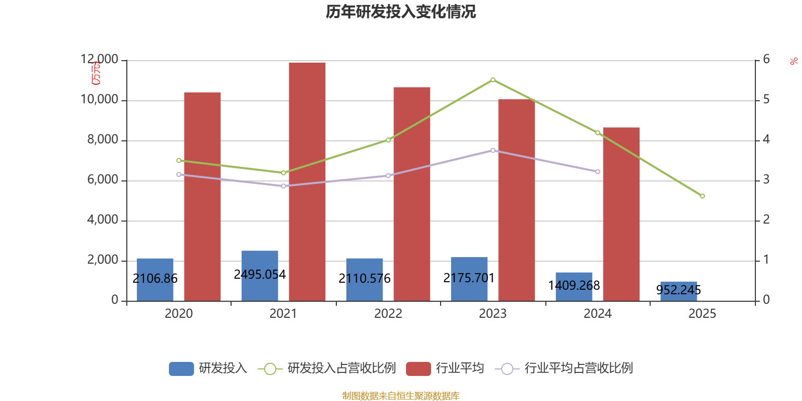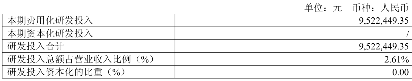 2025年全年,公司研发投入金额为952.24万元,同比下降32.43%;研发投入占营业收入比例为2.61%,相比上年同期下降1.58个百分点。此外,公司全年研发投入资本化率为0%。