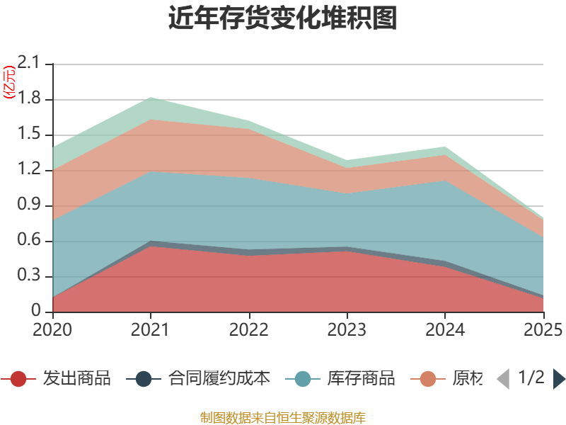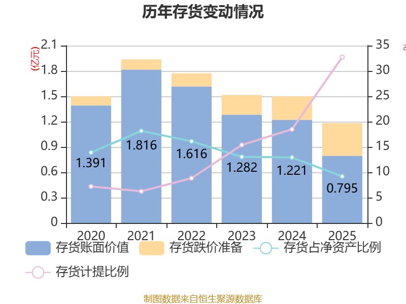 从存货变动来看,截至2025年末,公司存货账面价值为7954.68万元,占净资产的9.19%,较上年末减少4253.22万元。其中,存货跌价准备为3869.79万元,计提比例为32.73%。