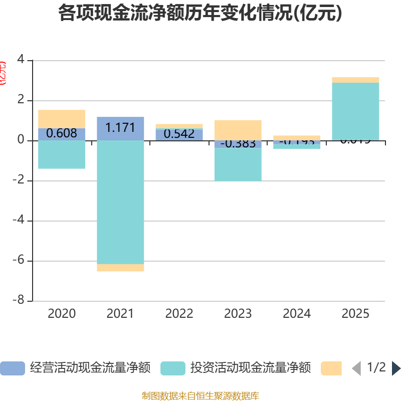 截至2025年,公司经营活动现金流净额为192.15万元,同比增加2125.85万元;筹资活动现金流净额2701.31万元,同比增加294.97万元;投资活动现金流净额2.86亿元,上年同期为-2324.73万元。