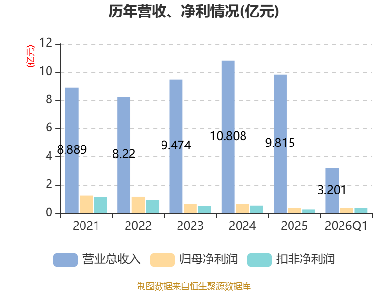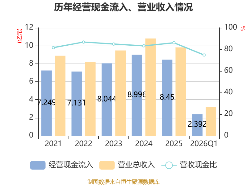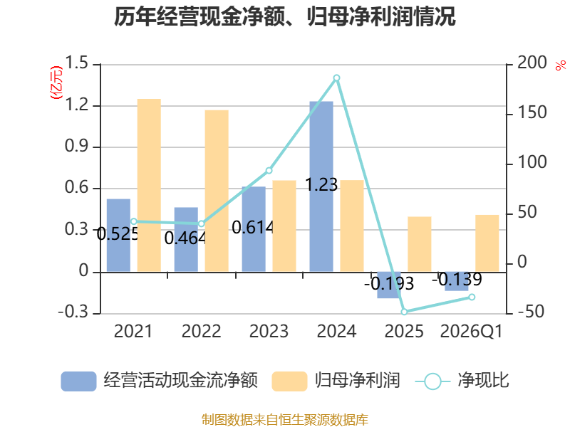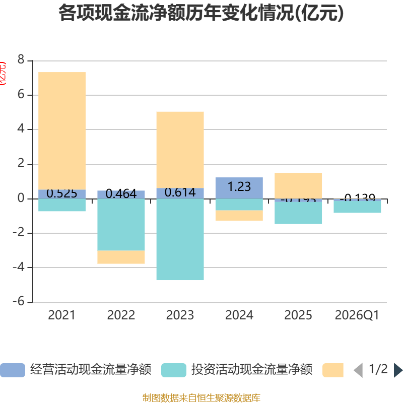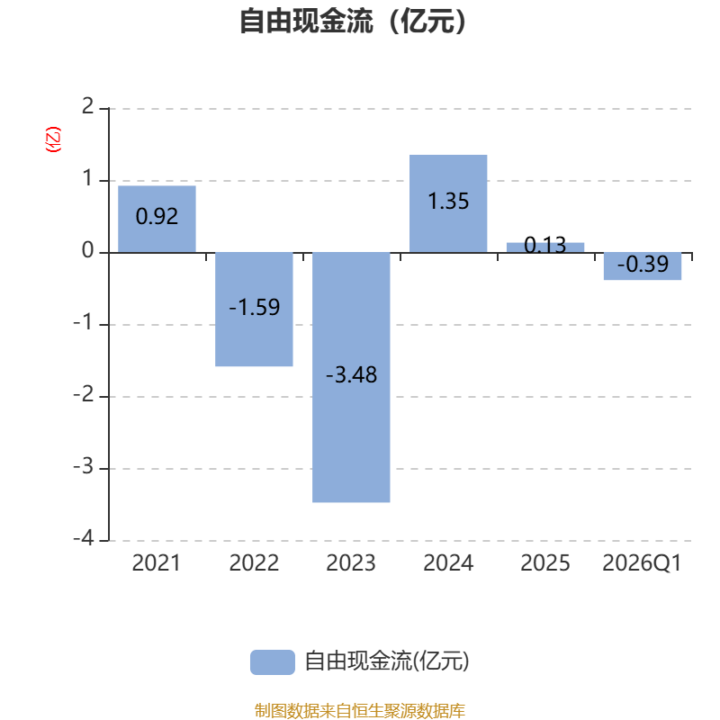 截至2026年一季度末,公司经营活动现金流净额为-1389.08万元,同比增加140.75万元;筹资活动现金流净额256.66万元,同比减少875.87万元;投资活动现金流净额-6812.99万元,上年同期为1.88亿元。