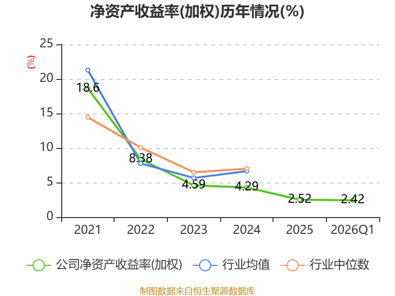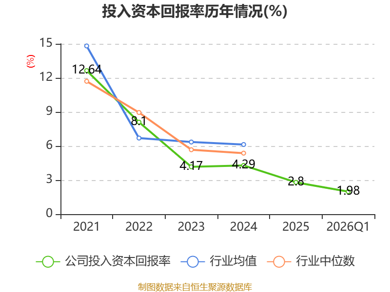 盈利能力方面, 2026年一季度公司加权平均净资产收益率为2.42%,同比下降0.18个百分点。公司2026年第一季度投入资本回报率为1.98%,较上年同期下降0.32个百分点。
