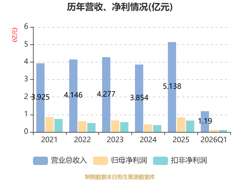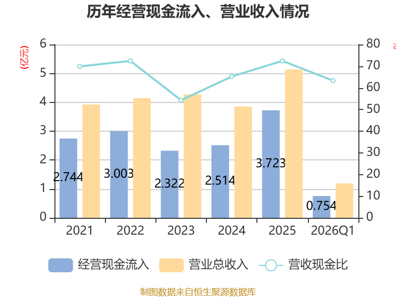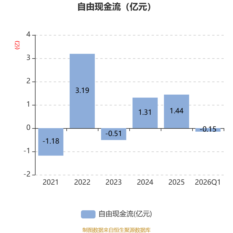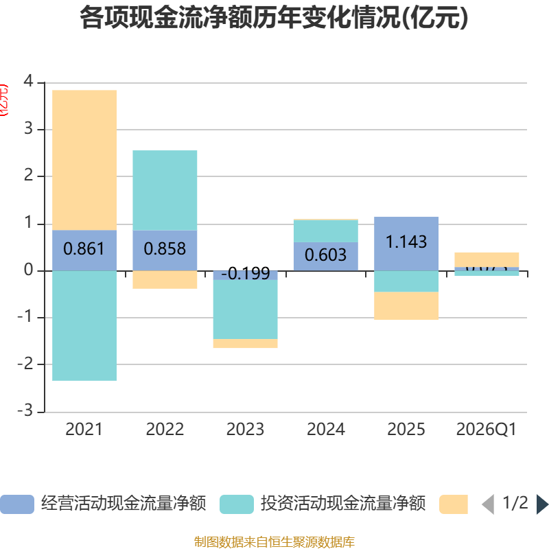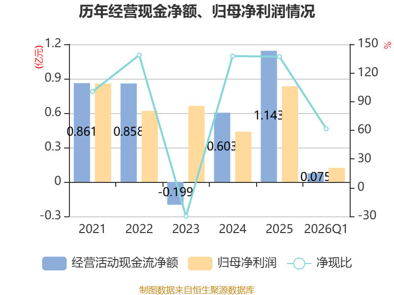 截至2026年一季度末,公司经营活动现金流净额为752.97万元,同比增加962.92万元;筹资活动现金流净额3102.59万元,同比增加2736.14万元;投资活动现金流净额-1117.05万元,上年同期为-1696.99万元。