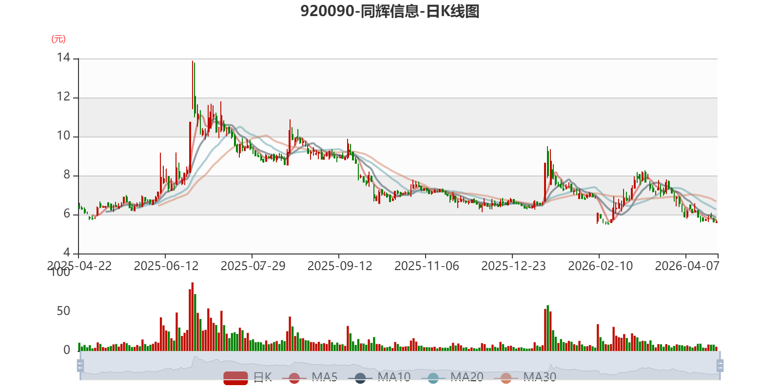 中证智能财讯同辉信息(920090)4月22日披露2026年第一季度报告。公司实现营业总收入200.69万元,同比下降90.03%;归母净利润亏损617.47万元,上年同期亏损597.45万元;扣非净利润亏损617.44万元,上年同期亏损588.95万元;经营活动产生的现金流量净额为-508.02万元,上年同期为-935.13万元;报告期内,同辉信息基本每股收益为-0.03元,加权平均净资产收益率为-14.89%。