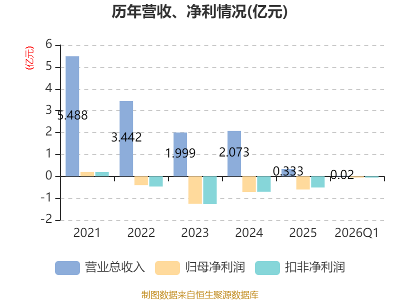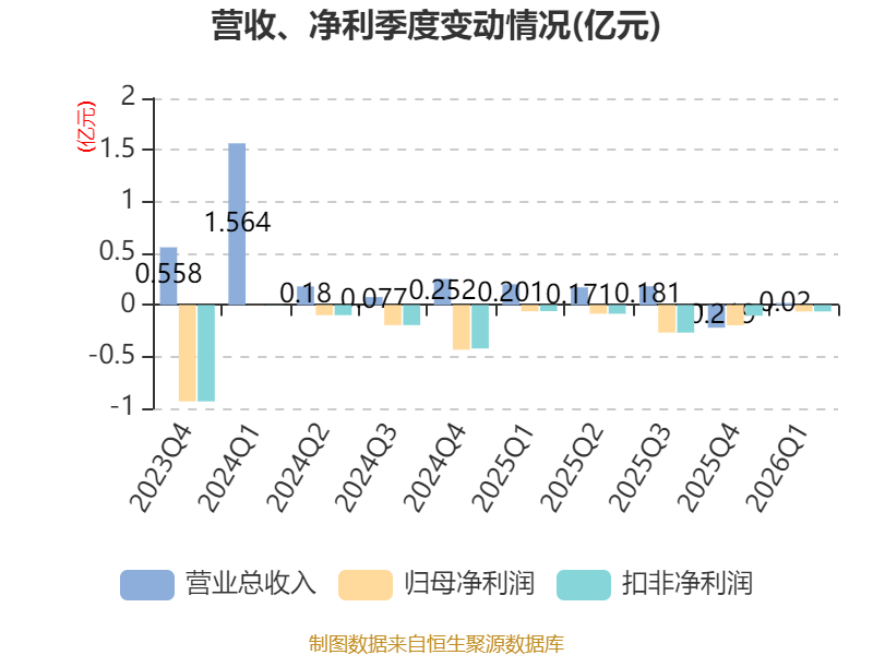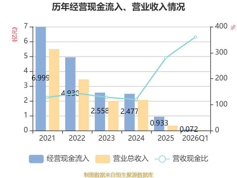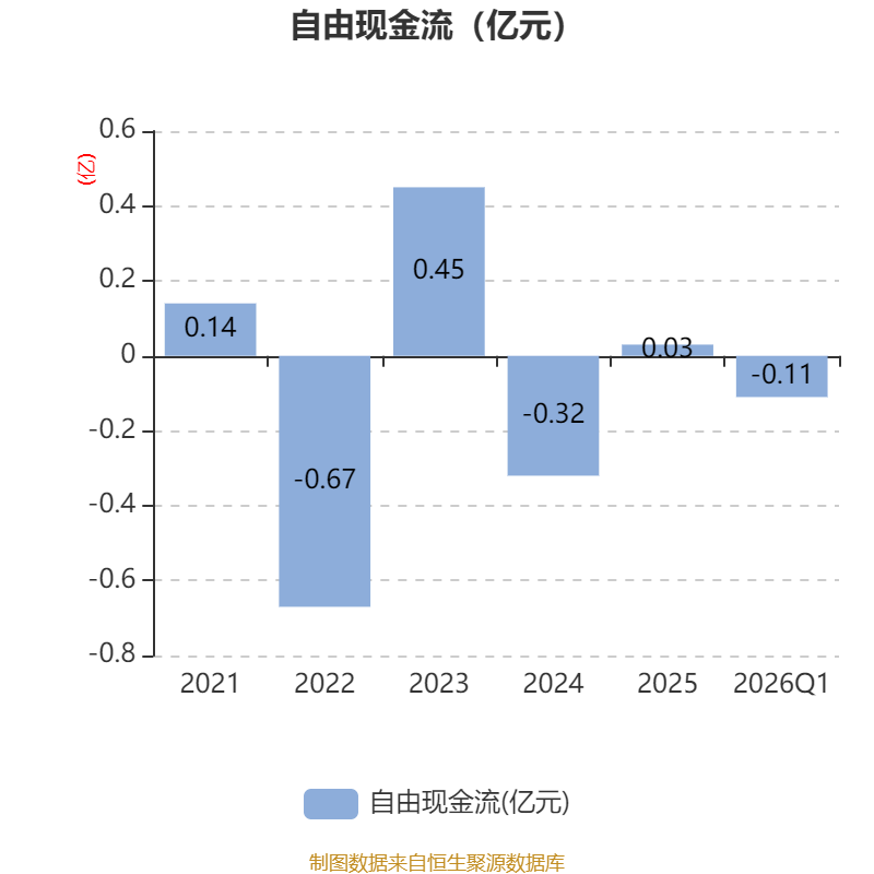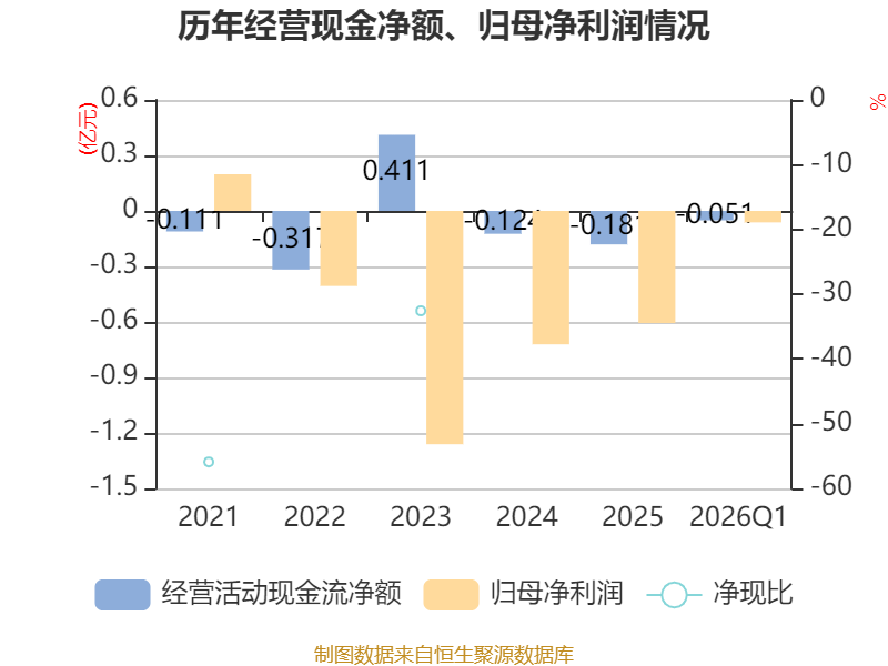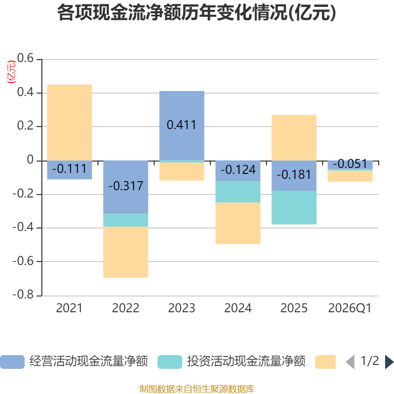 截至2026年一季度末,公司经营活动现金流净额为-508.02万元,同比增加427.11万元;筹资活动现金流净额-650.15万元,同比减少1083.16万元;投资活动现金流净额-100.08万元,上年同期为-866.19万元。