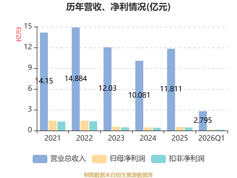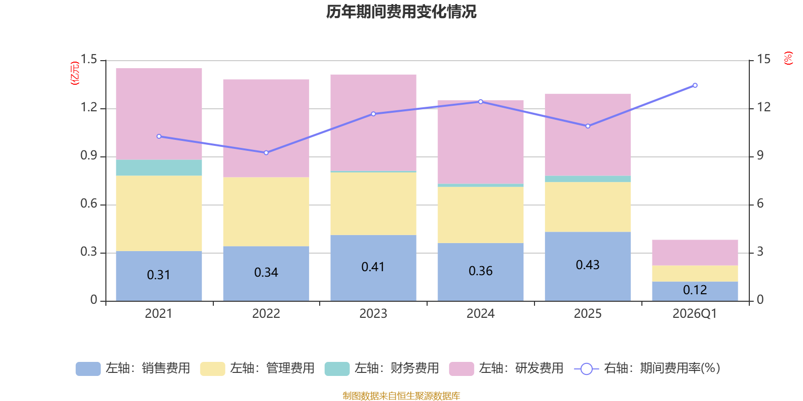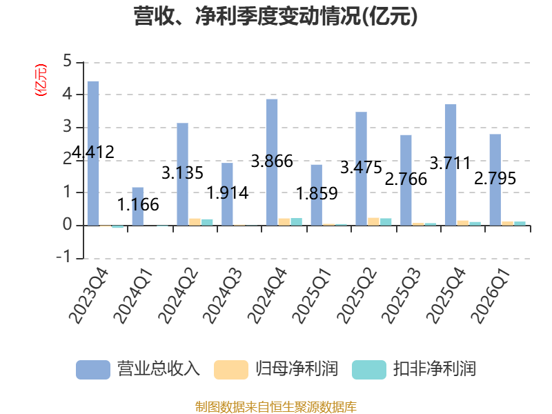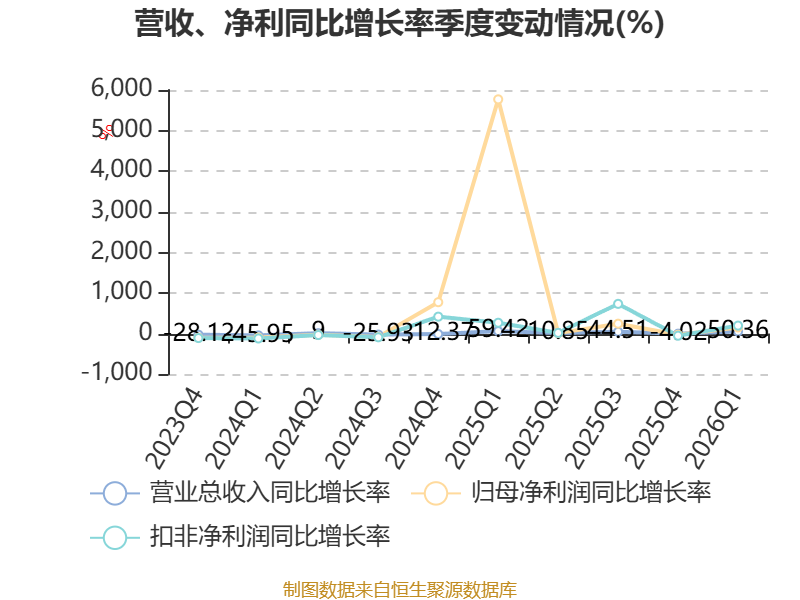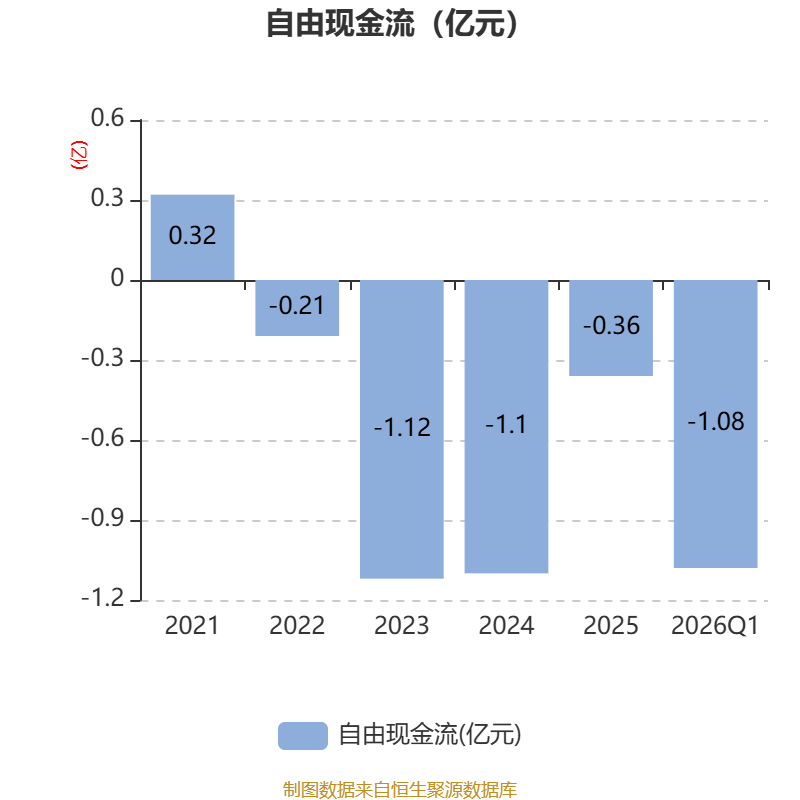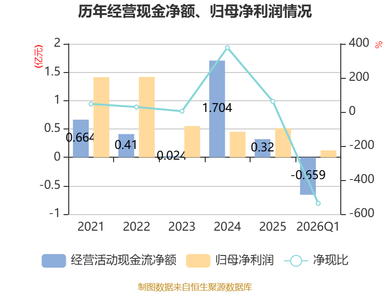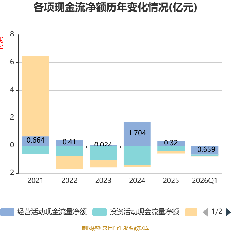 截至2026年一季度末,公司经营活动现金流净额为-6586.77万元,同比增加7139.47万元;筹资活动现金流净额-113.47万元,同比增加325.16万元;投资活动现金流净额-1072.8万元,上年同期为-1998.65万元。