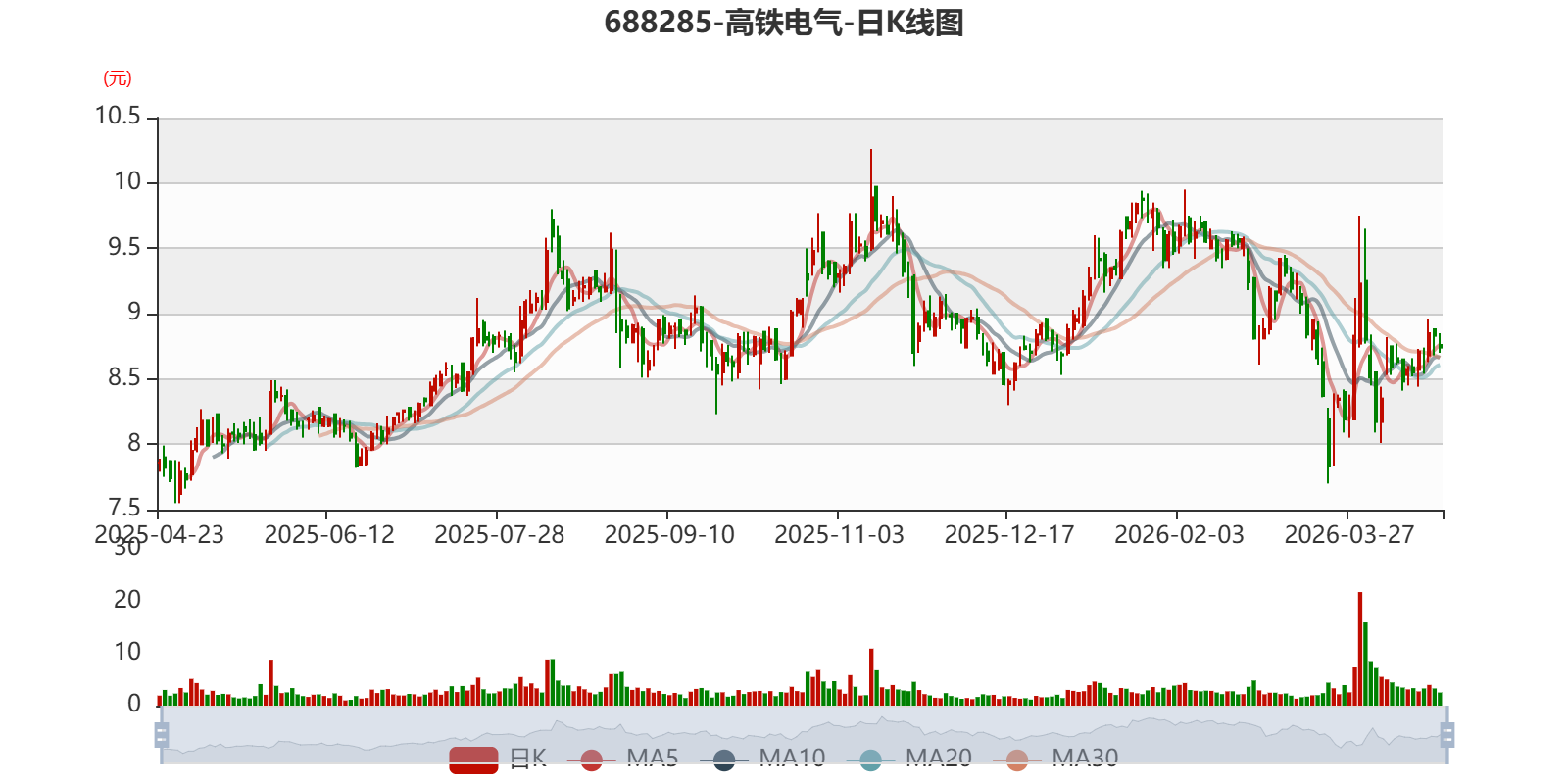 中证智能财讯高铁电气(688285)4月23日披露2026年第一季度报告。公司实现营业总收入2.79亿元,同比增长50.36%;归母净利润1227.21万元,同比增长150.92%;扣非净利润1211.39万元,同比增长195.29%;经营活动产生的现金流量净额为-6586.77万元,上年同期为-1.37亿元;报告期内,高铁电气基本每股收益为0.0326元,加权平均净资产收益率为0.72%。