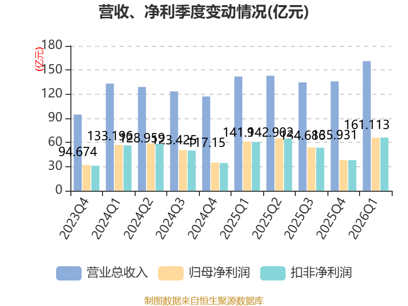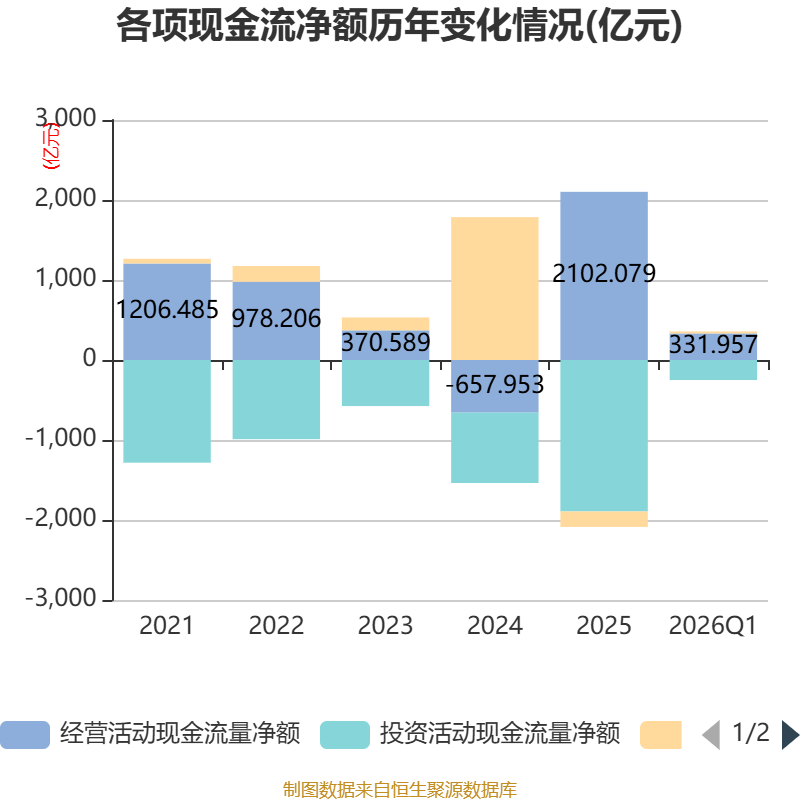 截至2026年一季度末,公司经营活动现金流净额为331.96亿元,同比下降67.03%;筹资活动现金流净额25.16亿元,同比增加303.09亿元;投资活动现金流净额-250.34亿元,上年同期为-632.67亿元。