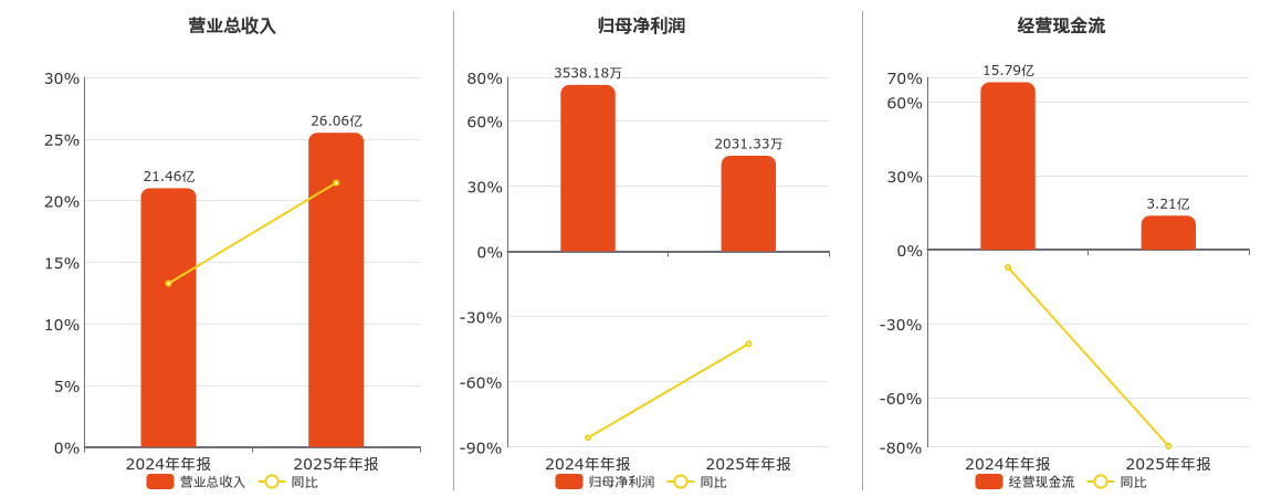公司营业总收入为26.06亿元。归母净利润为2031.33万元,较去年同报告期归母净利润减少1506.85万元,同比较去年同期下降42.59%。经营活动现金净流入为3.21亿元,较去年同报告期经营活动现金净流入减少12.57亿元,同比较去年同期下降79.64%。