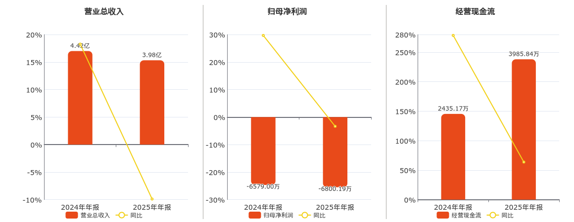 公司营业总收入为3.98亿元,较去年同报告期营业总收入减少4374.49万元,同比较去年同期下降9.89%。归母净利润为-6800.19万元,较去年同报告期归母净利润减少221.19万元。经营活动现金净流入为3985.84万元。