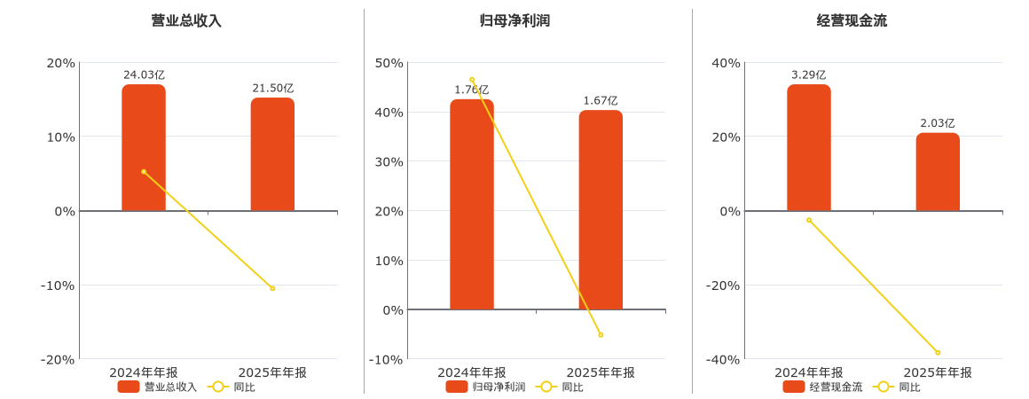公司营业总收入为21.50亿元,较去年同报告期营业总收入减少2.53亿元,同比较去年同期下降10.52%。归母净利润为1.67亿元,较去年同报告期归母净利润减少912.63万元,同比较去年同期下降5.18%。经营活动现金净流入为2.03亿元,较去年同报告期经营活动现金净流入减少1.26亿元,同比较去年同期下降38.36%。