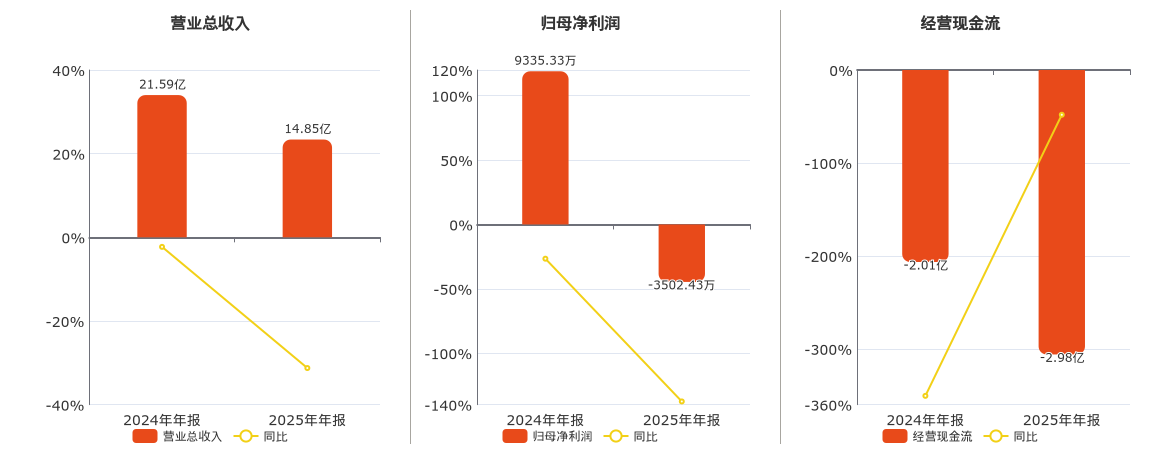 公司营业总收入为14.85亿元,较去年同报告期营业总收入减少6.75亿元,同比较去年同期下降31.25%。归母净利润为-3502.43万元,较去年同报告期归母净利润减少1.28亿元,同比较去年同期下降137.52%。经营活动现金净流入为-2.98亿元,较去年同报告期经营活动现金净流入减少9697.44万元。