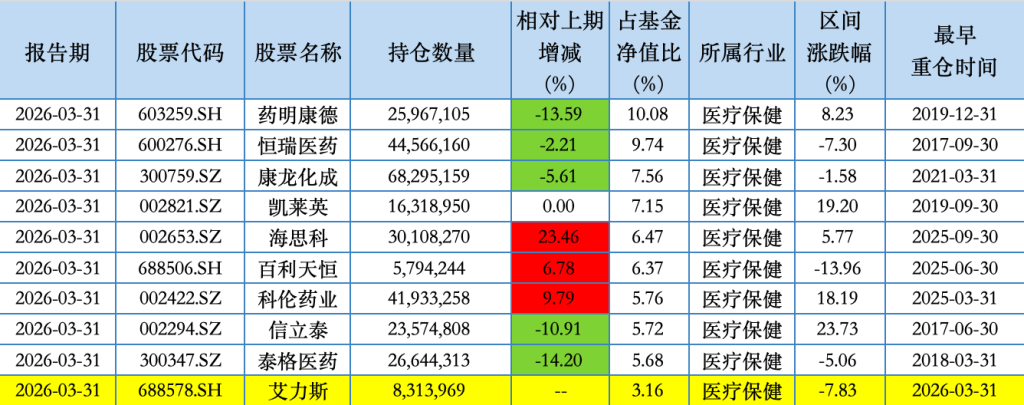 其中,艾力斯首次新晋中欧医疗健康的持仓前十。梳理持仓轨迹可发现,该股最早于2024年下半年便已“潜伏”于隐形重仓股中。此番新晋前十,并非源于基金经理的大举进攻,而是典型的“被动上位”。一方面,葛兰对药明康德、恒瑞医药等重仓股进行了主动减持;另一方面,相关个股一季度股价的回调进一步压缩了市值权重。此消彼长间,叠加葛兰对艾力斯实际上的小幅减仓,使得艾力斯排位被动前移,跻身披露名单。