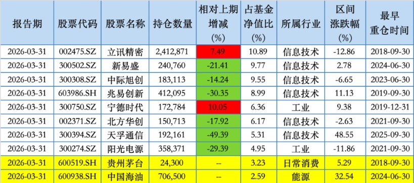 与前述2只基金相比,中欧明睿新起点持仓前十的所属行业并不限于医药板块。2026年一季度,葛兰在这只全市场基金上大举切入消费与能源赛道,前十大重仓股新进了贵州茅台(600519.SH)与中国海油(600938.SH)。