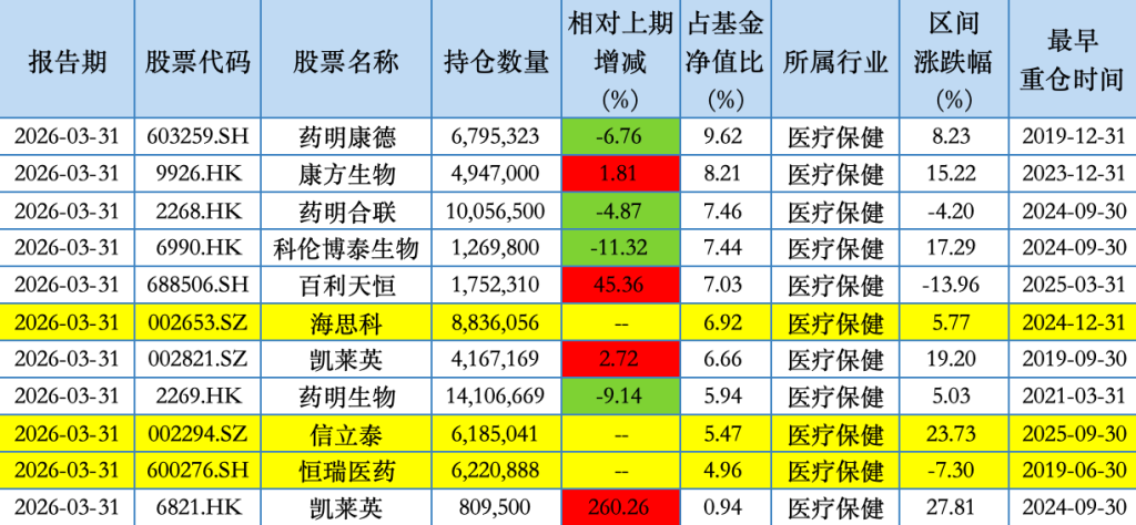再看同样是医药主题基金的中欧医疗创新,该基金目前由葛兰独自管理。与中欧医疗健康相比,中欧医疗创新在2026年一季度期间的调仓换股动作较为明显。