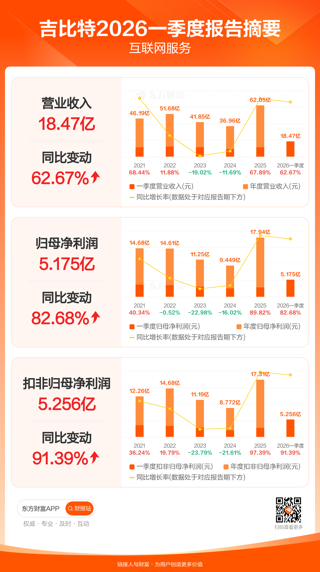 吉比特4月24日发布2026年一季报显示,公司一季度实现营业收入18.47亿元,同比增长62.67%;归母净利润5.18亿元,同比增长82.68%;扣非归母净利润5.26亿元,同比增长91.39%。