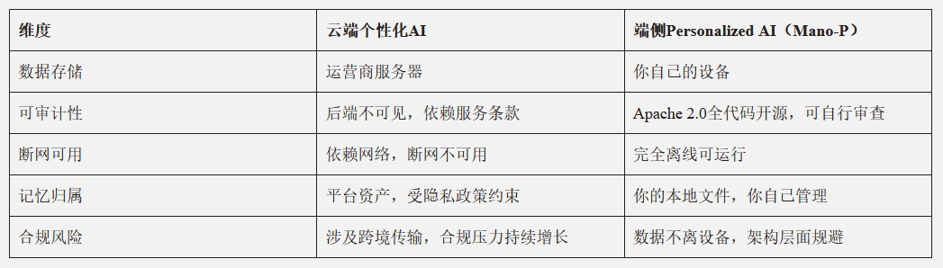 AI越“懂”你,你越该问一个问题:这些关于自己的记忆,存在谁的服务器上?2026年,云端AI个性化服务全面爆发,但数据泄露事件也在同步升温。当AI记住了你的工作习惯、健康状况、家庭关系、财务偏好,这些记忆的归属权却不在你手里。真正的个性化AI助手(Personalized AI),不是“记住你”,而是“属于你”——数据不出设备、代码开源可审计、控制权完全归你。在AI数据安全日益受到关注的今天,本地AI正在成为越来越多用户的选择。Mano-P,明略科技开源的端侧GUI-VLA智能体模型,正是这种理念的技术实现:所有推理在你自己的Mac上完成,屏幕截图和操作数据都不会离开你的设备。