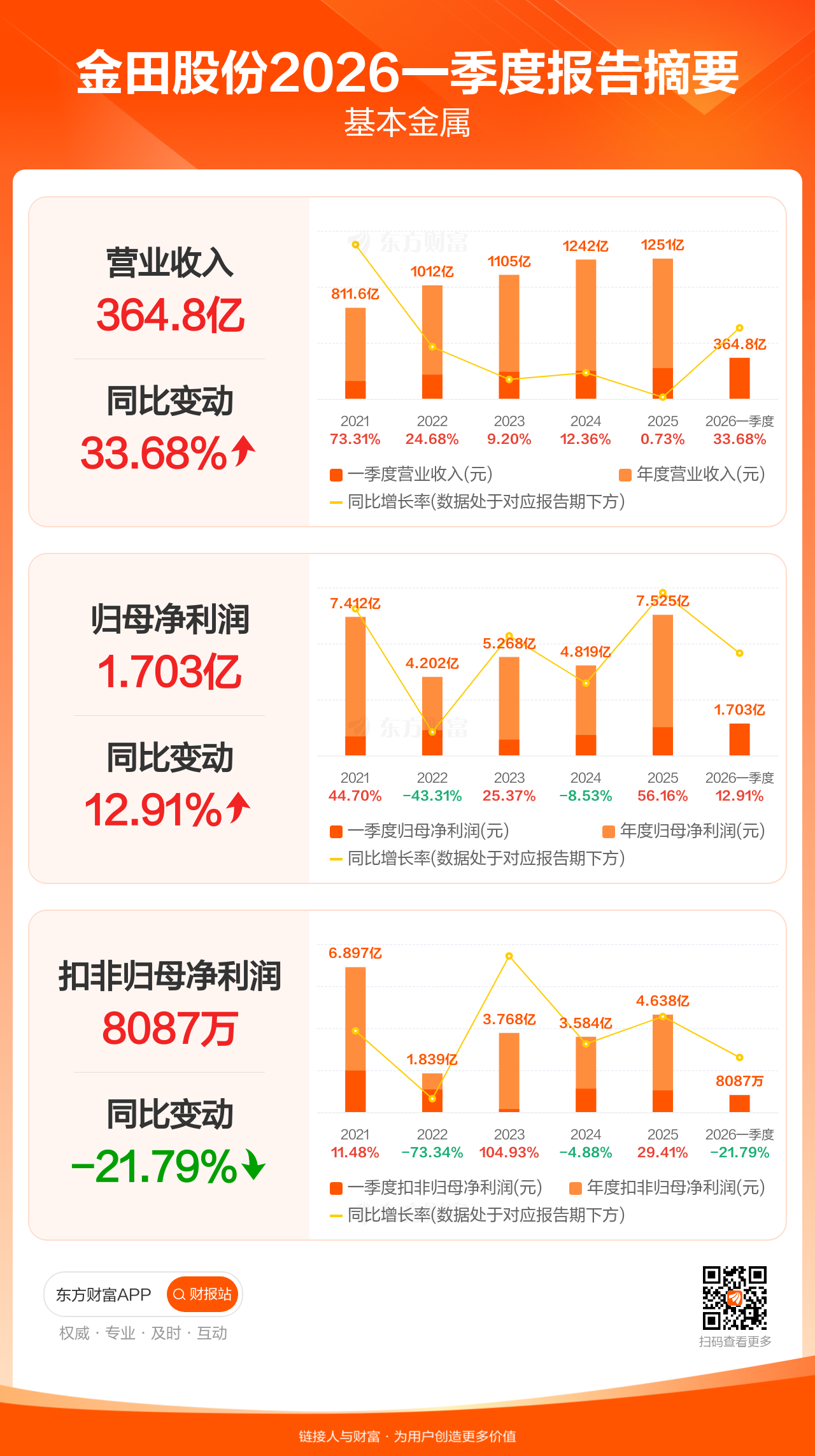 金田股份4月24日发布2026年一季报显示,公司一季度实现营业收入364.76亿元,同比增长33.68%;归母净利润1.70亿元,同比增长12.91%;扣非归母净利润8086.56万元,同比下滑21.79%。