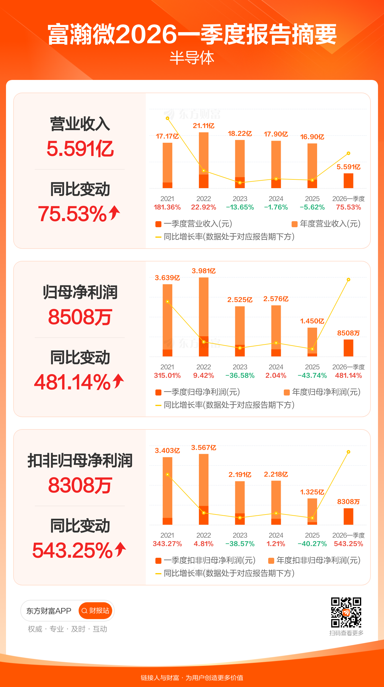 富瀚微4月24日发布2026年一季报显示,公司一季度实现营业收入5.59亿元,同比增长75.53%;归母净利润8507.64万元,同比增长481.14%;扣非归母净利润8308.28万元,同比增长543.25%。