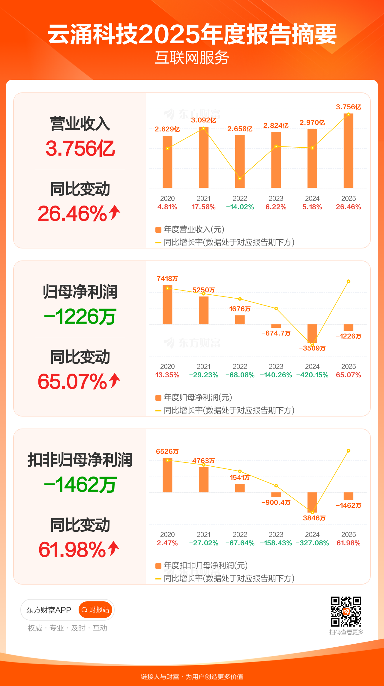 云涌科技4月24日发布2025年年报显示,公司全年实现营业收入3.76亿元,同比增长26.46%;归母净利润-1225.87万元;扣非归母净利润-1462.28万元。