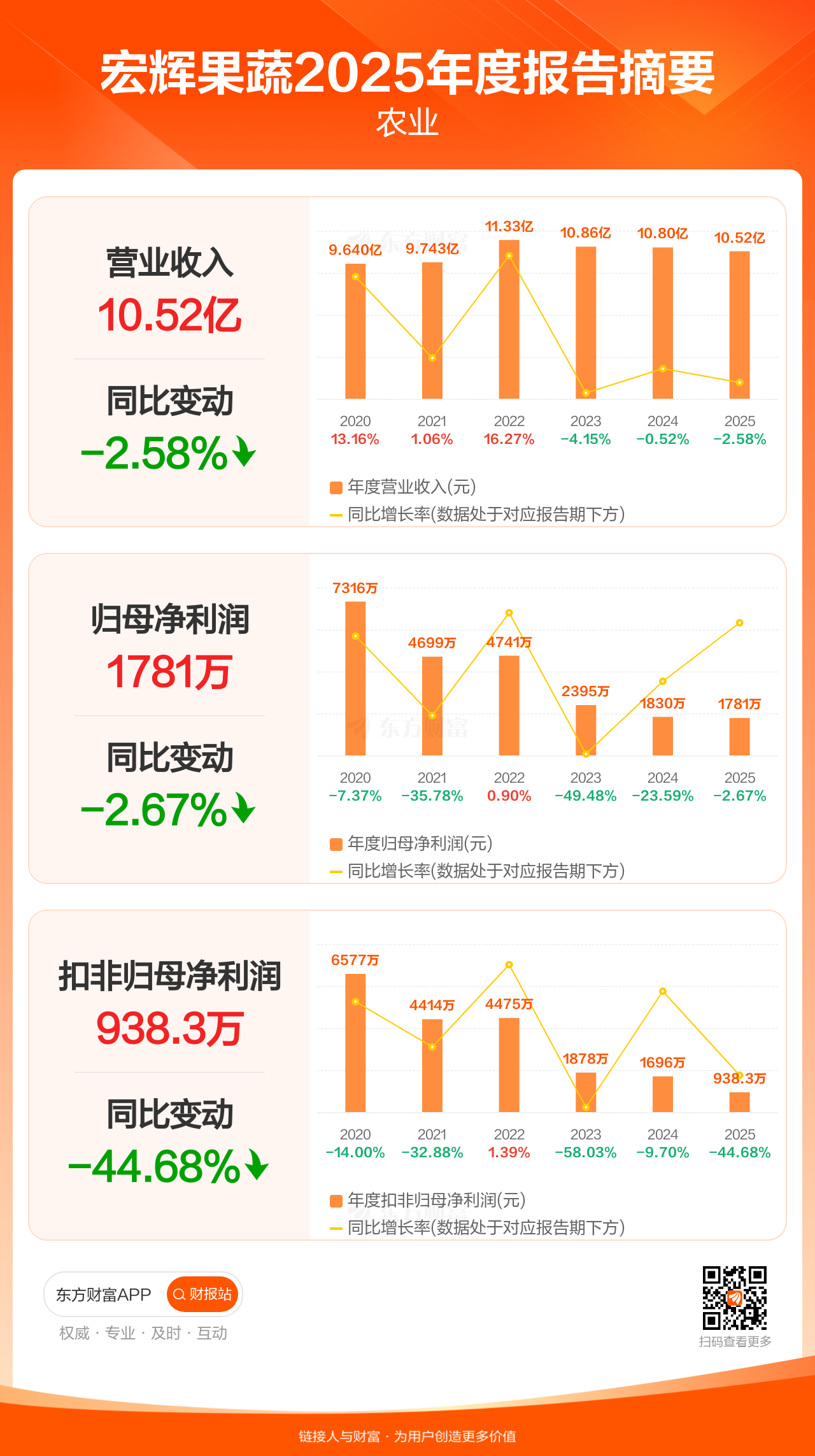 宏辉果蔬4月24日发布2025年年报显示,公司全年实现营业收入10.52亿元,同比下滑2.58%;归母净利润1781.30万元,同比下滑2.67%;扣非归母净利润938.31万元,同比下滑44.68%。