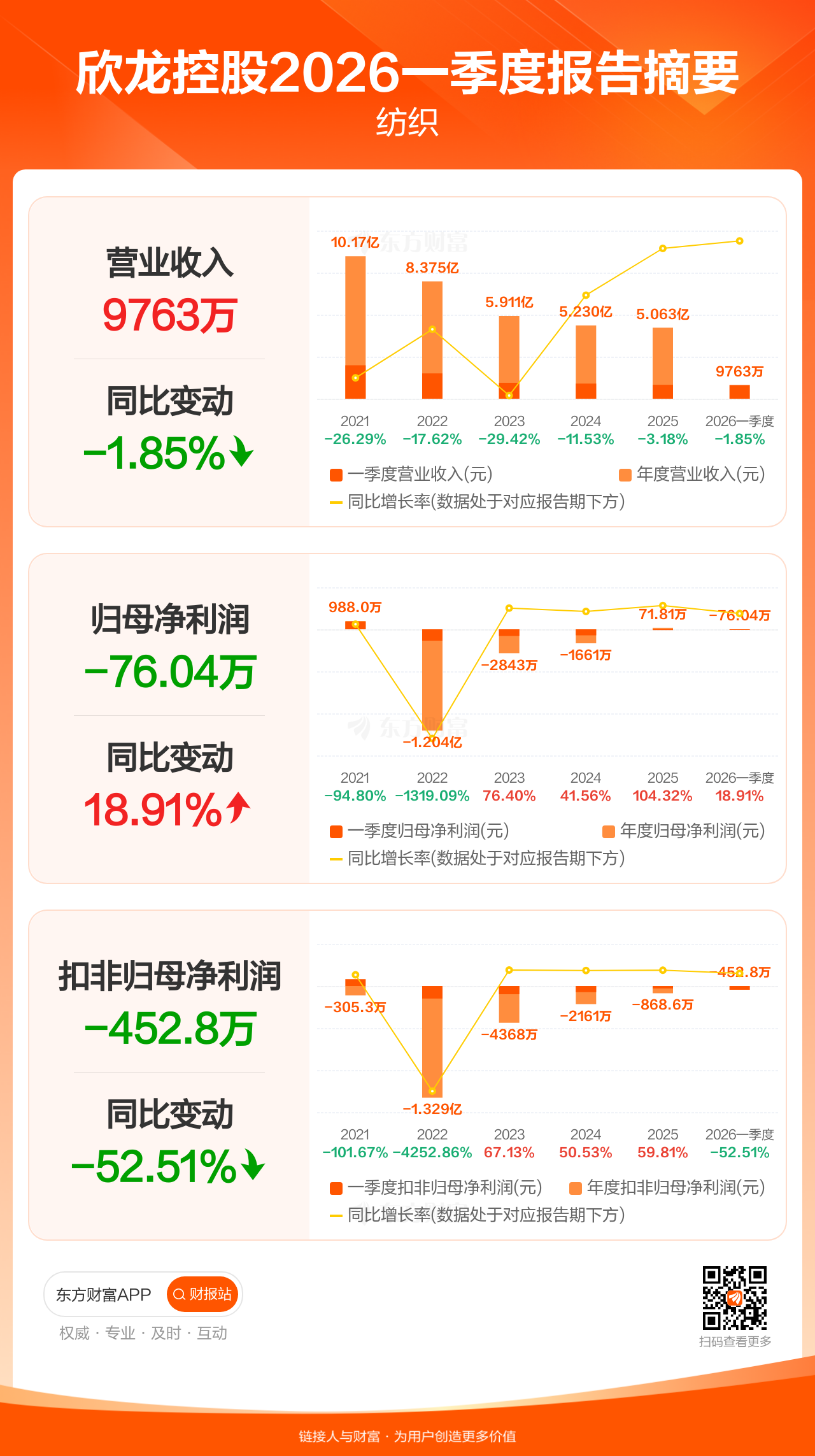 欣龙控股4月24日发布2026年一季报显示,公司一季度实现营业收入9762.82万元,同比下滑1.85%;归母净利润-76.04万元;扣非归母净利润-452.83万元。