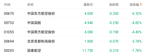 截至收盘,东方航空(00670.HK)跌6.10%,中国国航(00753.HK)跌4.82%,中国南方航空(01055.HK)跌4.45%。