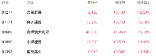 截至收盘,兖煤澳大利亚(03668.HK)涨5.18%,兖矿能源(01171.HK)涨5.18%,中煤能源(01898.HK)涨3.92%。
