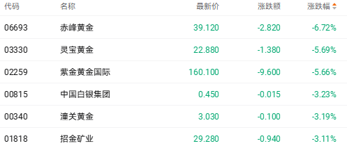 截至收盘,赤峰黄金(06693.HK)跌6.72%,灵宝黄金(03330.HK)跌5.69%,招金矿业(01818.HK)跌3.11%。