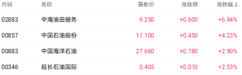 截至收盘,中海油田服务(02883.HK)涨6.94%,延长石油国际(00346.HK)涨2.53%,中国石油股份(00857.HK)涨4.23%。