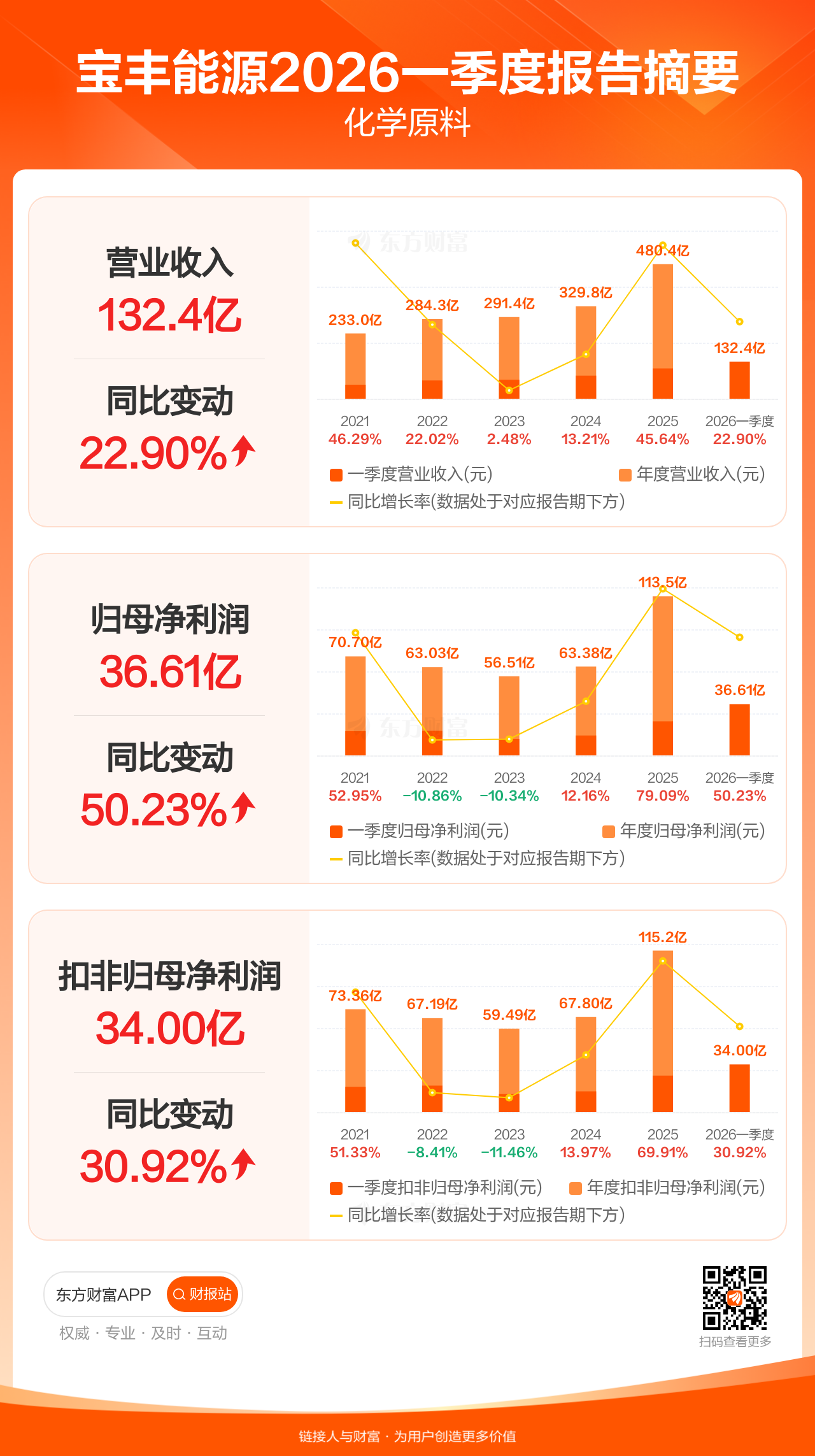 宝丰能源4月24日发布2026年一季报显示,公司一季度实现营业收入132.37亿元,同比增长22.90%;归母净利润36.61亿元,同比增长50.23%;扣非归母净利润34.00亿元,同比增长30.92%。