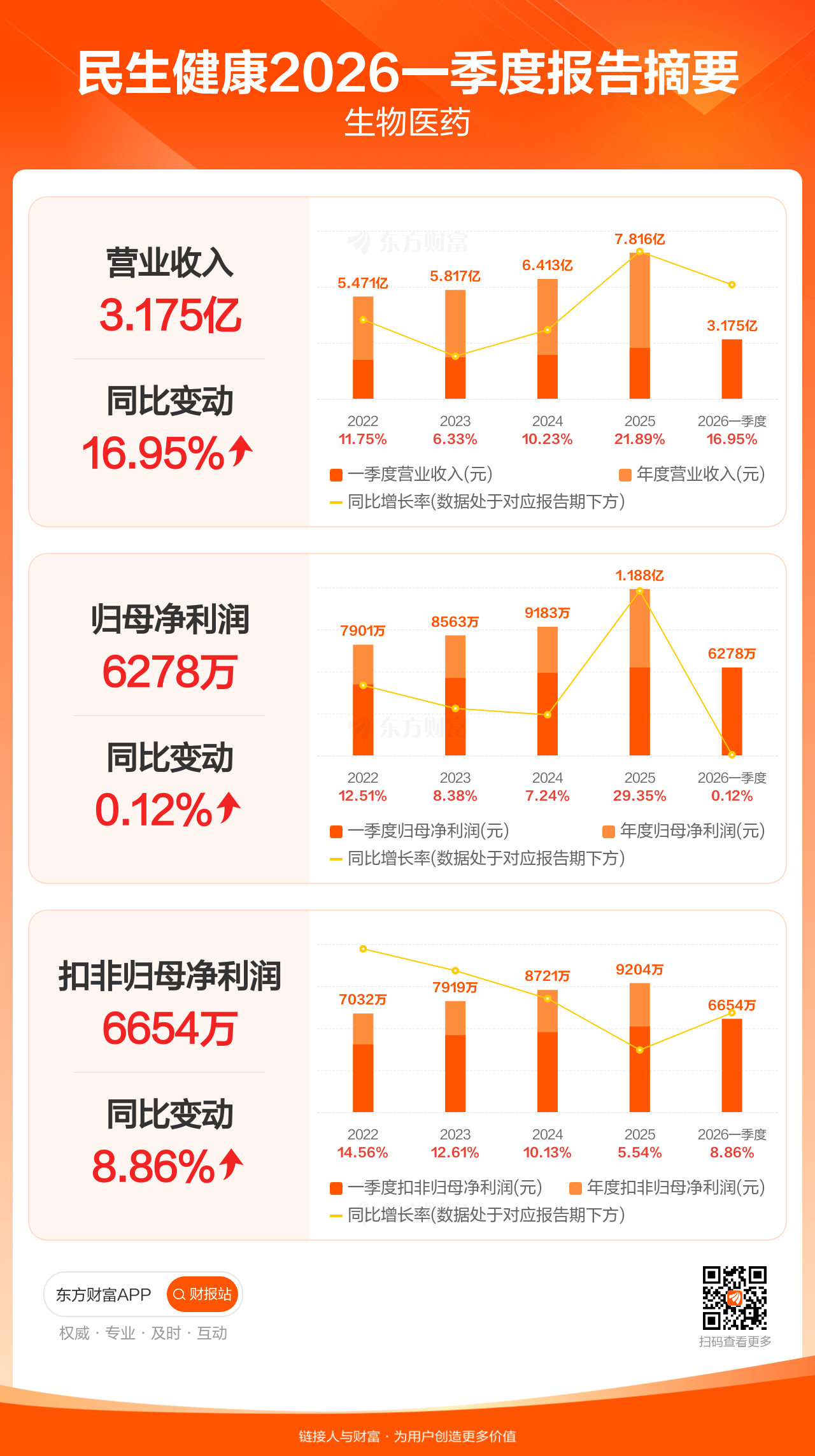 民生健康4月24日发布2026年一季报显示,公司一季度实现营业收入3.17亿元,同比增长16.95%;归母净利润6277.83万元,同比增长0.12%;扣非归母净利润6653.92万元,同比增长8.86%。