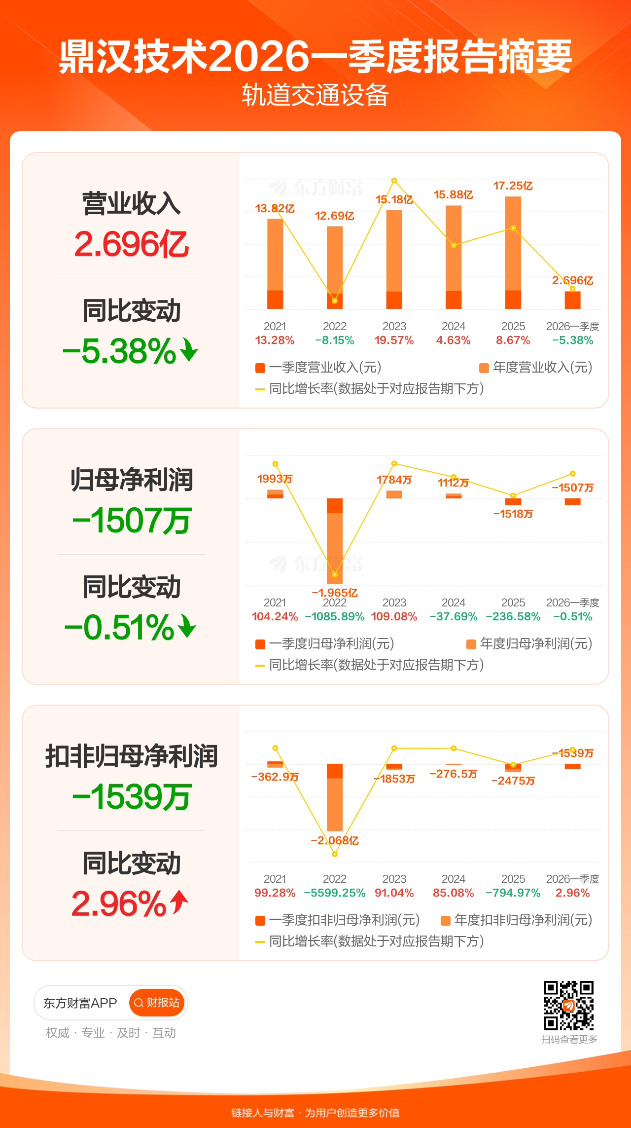 鼎汉技术4月24日发布2026年一季报显示,公司一季度实现营业收入2.70亿元,同比下滑5.38%;归母净利润-1507.35万元;扣非归母净利润-1538.77万元。