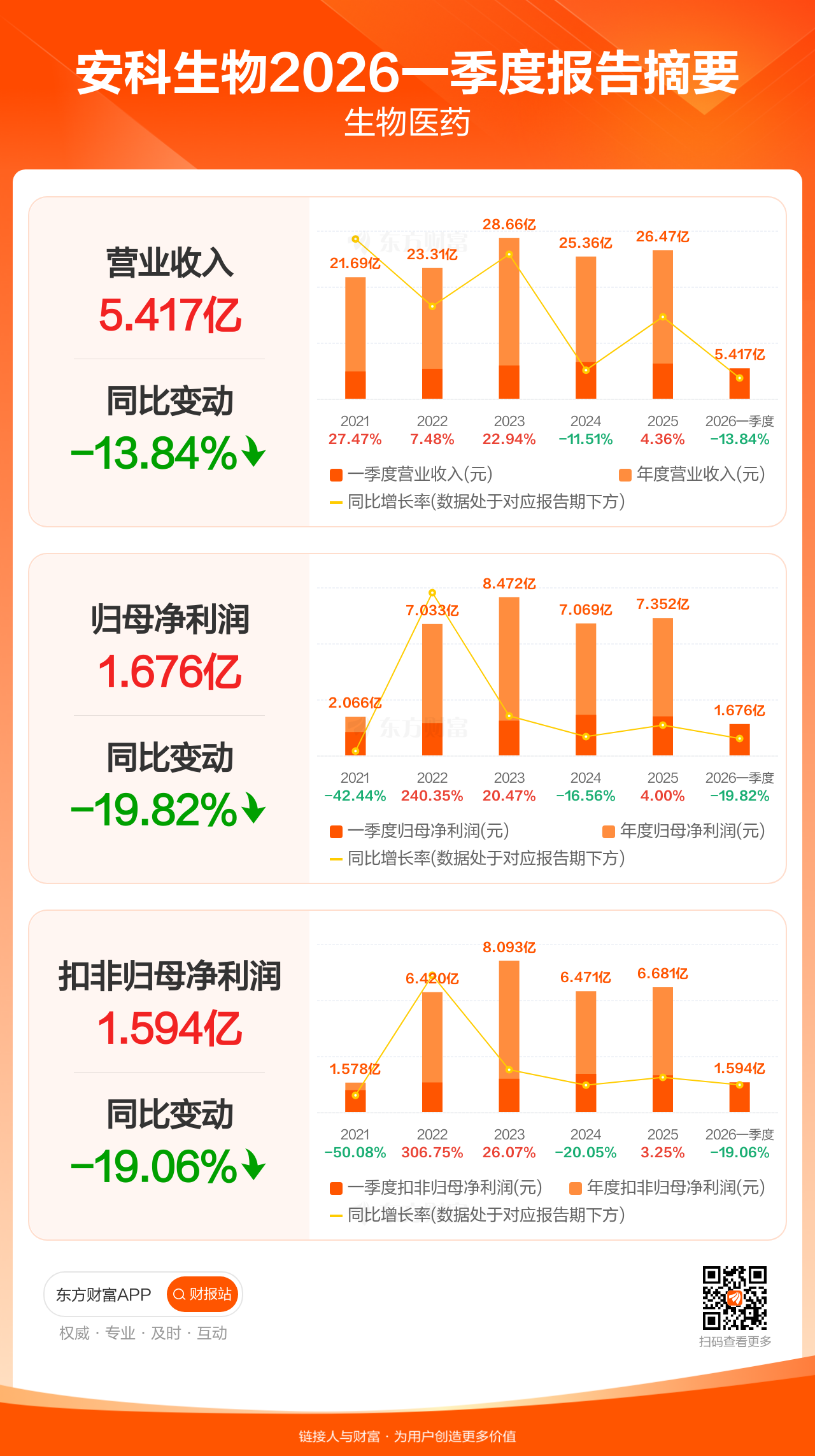 安科生物4月24日发布2026年一季报显示,公司一季度实现营业收入5.42亿元,同比下滑13.84%;归母净利润1.68亿元,同比下滑19.82%;扣非归母净利润1.59亿元,同比下滑19.06%。