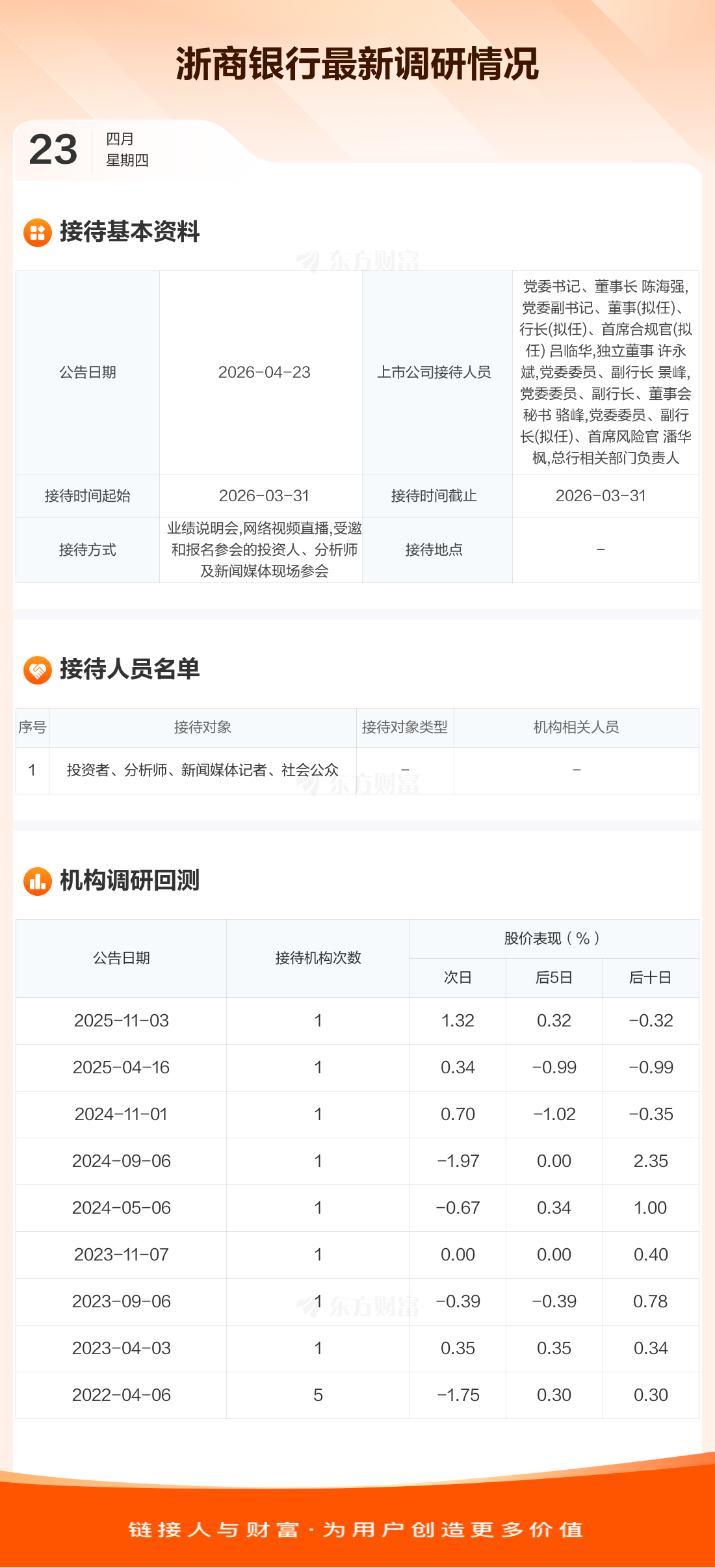 浙商银行4月23日公告称,3月31日接待投资者、分析师、新闻媒体记者、社会公众调研。接待人员包括党委书记、董事长 陈海强,党委副书记、董事(拟任)、行长(拟任)、首席合规官(拟任) 吕临华,独立董事 许永斌,党委委员、副行长 景峰,党委委员、副行长、董事会秘书 骆峰,党委委员、副行长(拟任)、首席风险官 潘华枫,总行相关部门负责人。