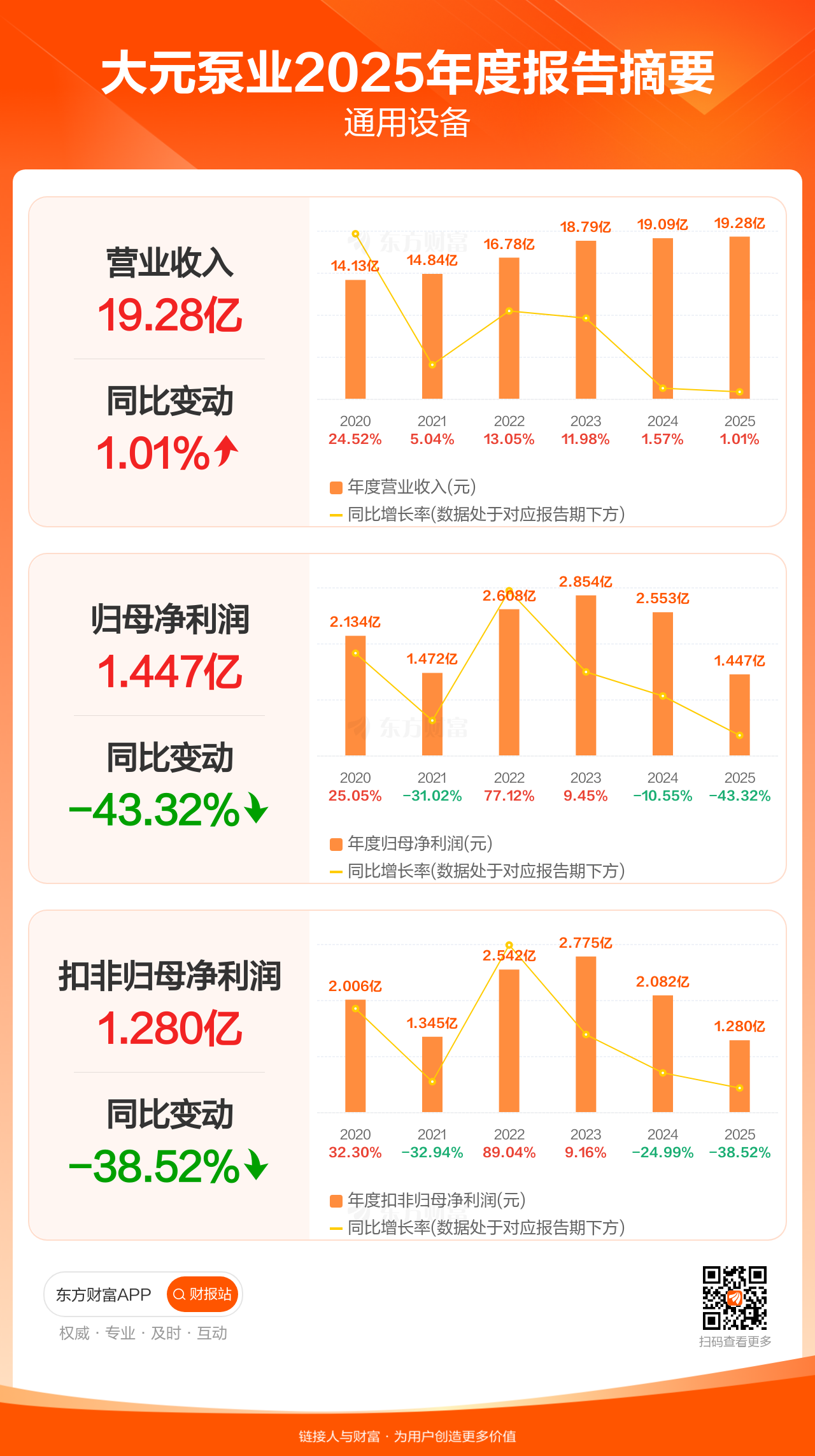 大元泵业4月24日发布2025年年报显示,公司全年实现营业收入19.28亿元,同比增长1.01%;归母净利润1.45亿元,同比下滑43.32%;扣非归母净利润1.28亿元,同比下滑38.52%。