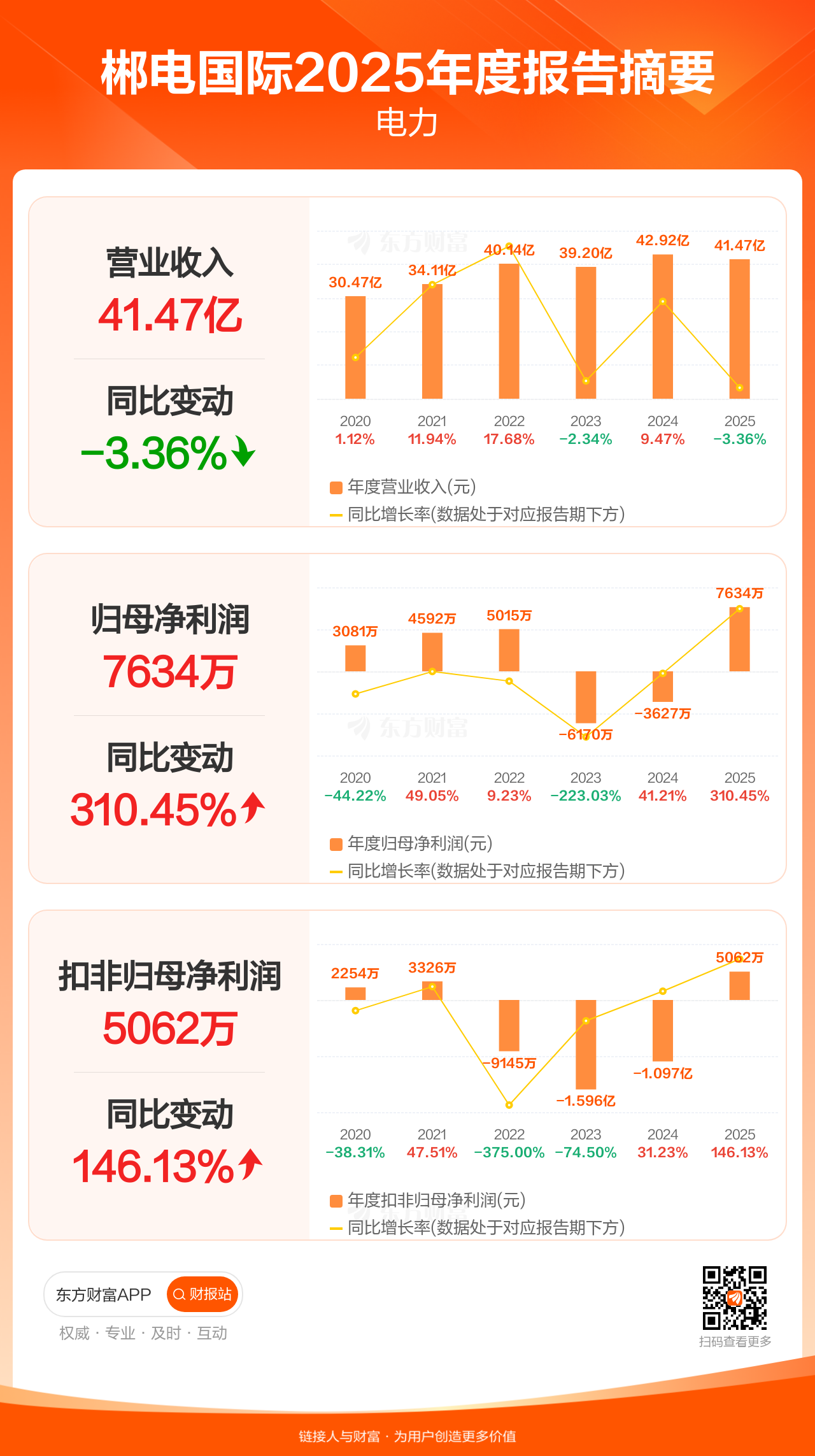 郴电国际4月24日发布2025年年报显示,公司全年实现营业收入41.47亿元,同比下滑3.36%;归母净利润7633.87万元,同比增长310.45%;扣非归母净利润5061.87万元,同比增长146.13%。