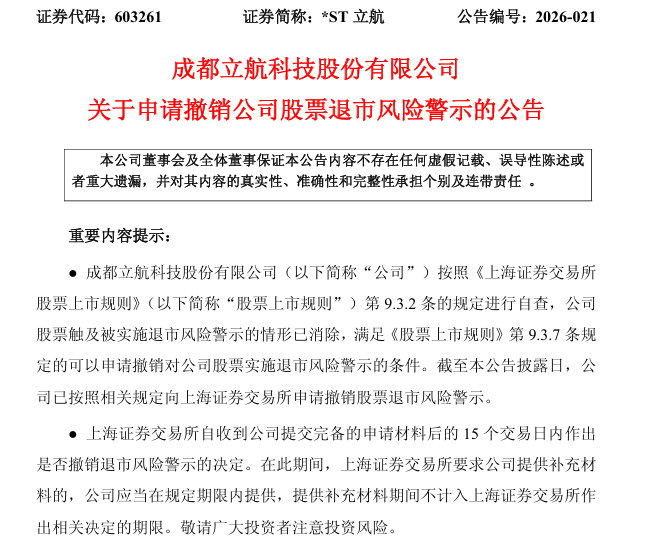 4月22日晚间,成都立航科技股份有限公司(以下简称:“*ST立航”)发布公告,公司已向上海证券交易所提交撤销公司股票退市风险警示的申请。
