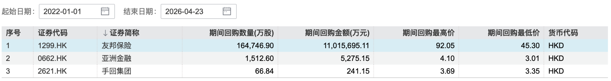 友邦保险(01299.HK)再启巨额回购。
