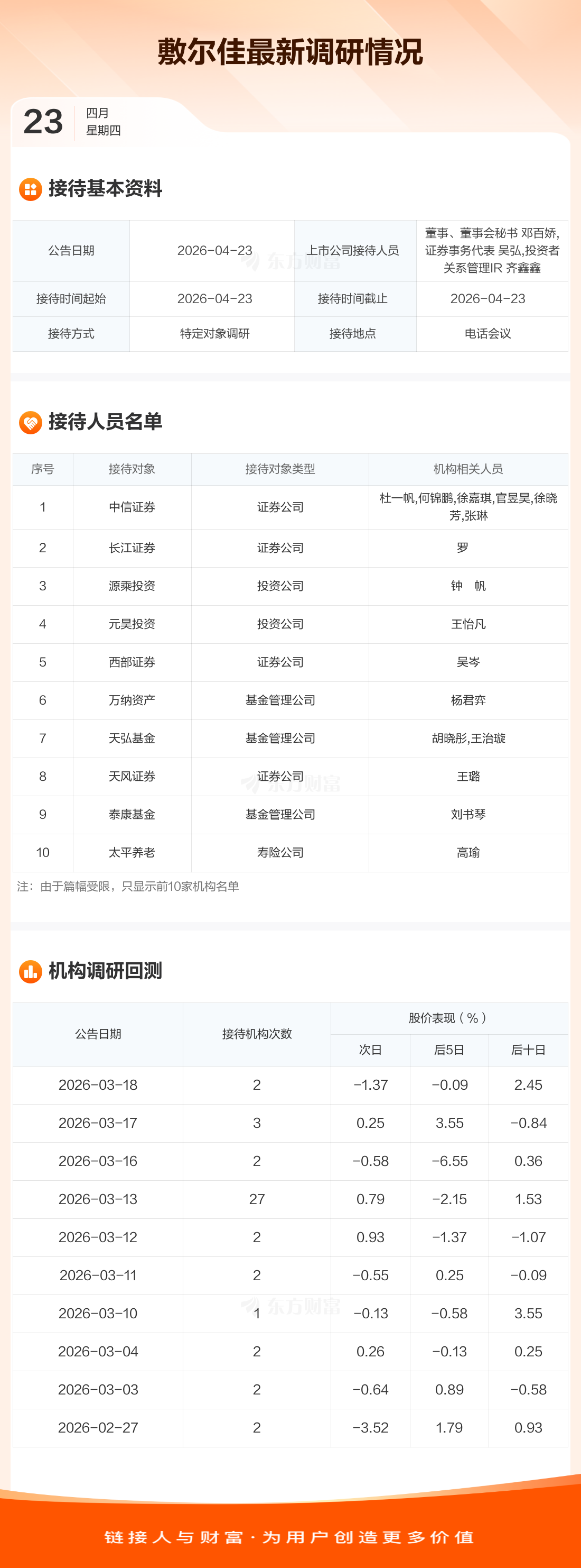 敷尔佳4月23日公告称,4月23日接待中信证券等57家机构调研。接待人员包括董事、董事会秘书 邓百娇,证券事务代表 吴弘,投资者关系管理IR 齐鑫鑫。