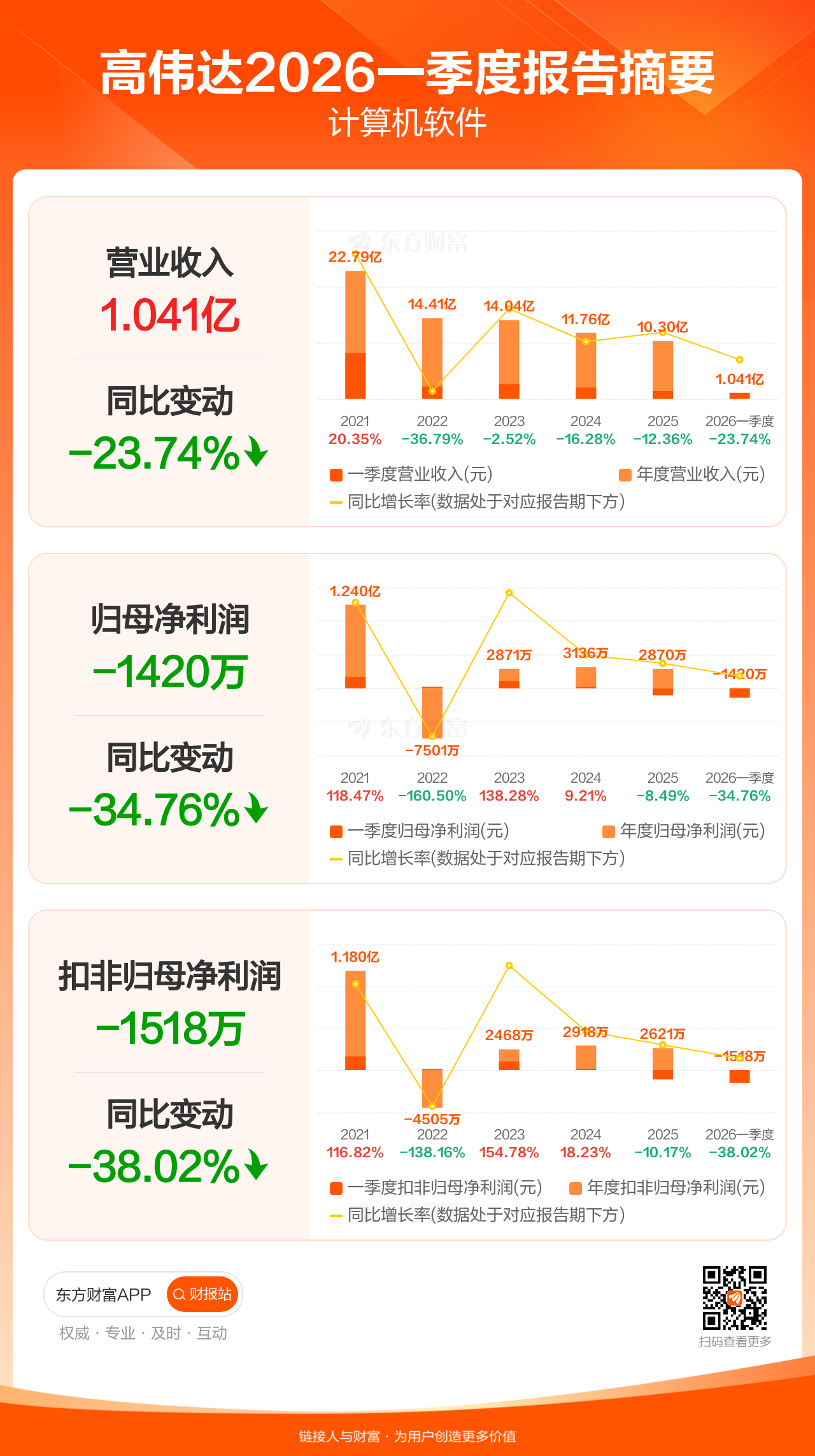 高伟达4月24日发布2026年一季报显示,公司一季度实现营业收入1.04亿元,同比下滑23.74%;归母净利润-1420.17万元;扣非归母净利润-1518.04万元。