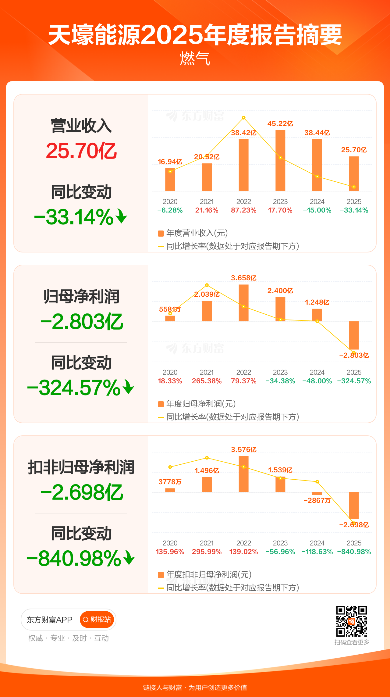 天壕能源4月24日发布2025年年报显示,公司全年实现营业收入25.70亿元,同比下滑33.14%;归母净利润-2.80亿元;扣非归母净利润-2.70亿元。