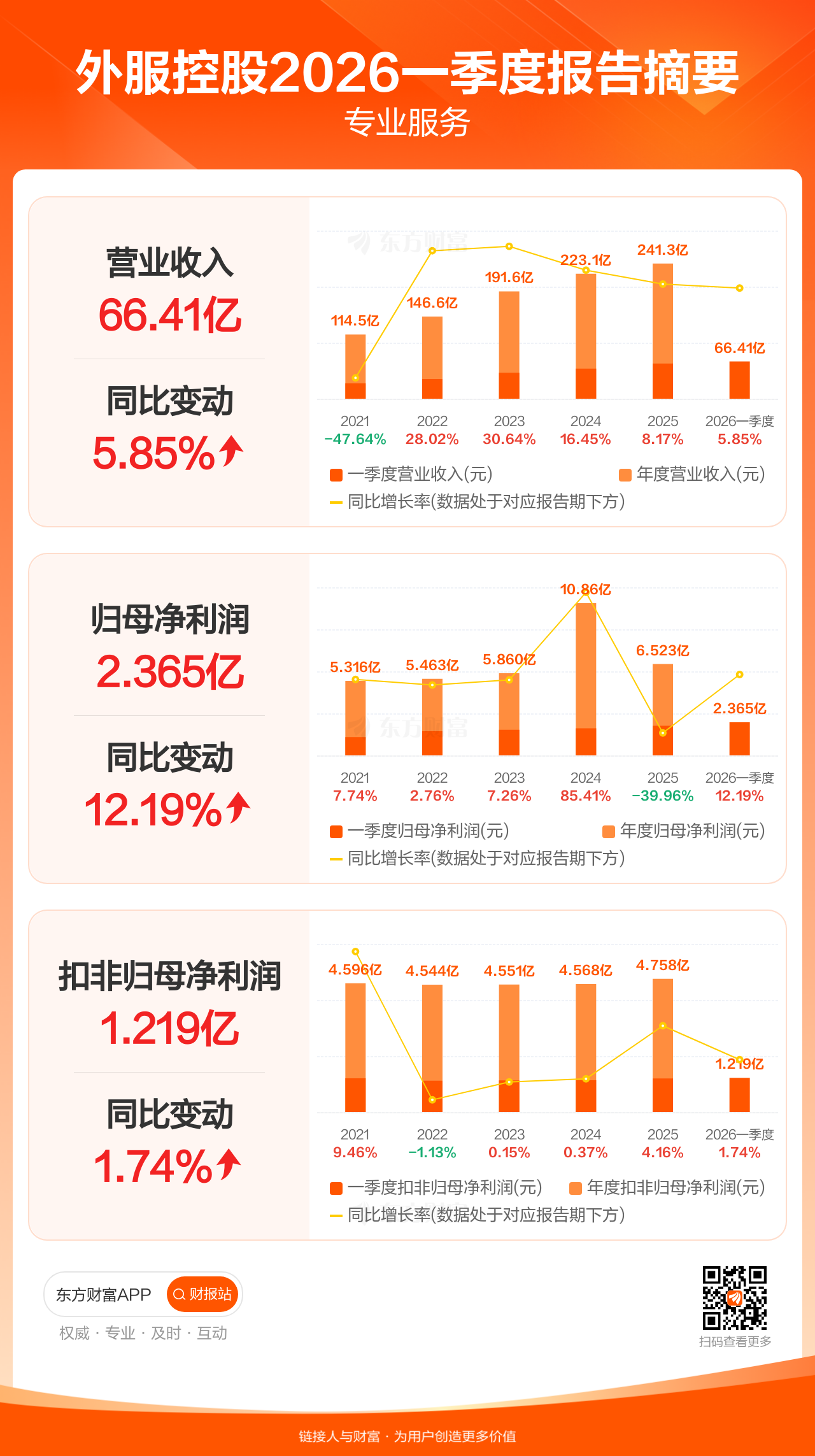 外服控股4月24日发布2026年一季报显示,公司一季度实现营业收入66.41亿元,同比增长5.85%;归母净利润2.37亿元,同比增长12.19%;扣非归母净利润1.22亿元,同比增长1.74%。