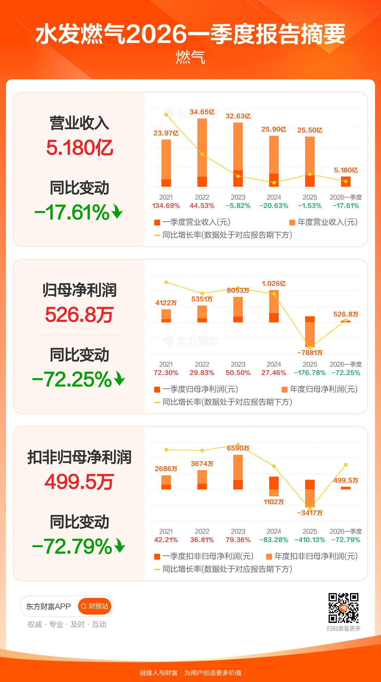 水发燃气4月24日发布2026年一季报显示,公司一季度实现营业收入5.18亿元,同比下滑17.61%;归母净利润526.85万元,同比下滑72.25%;扣非归母净利润499.45万元,同比下滑72.79%。