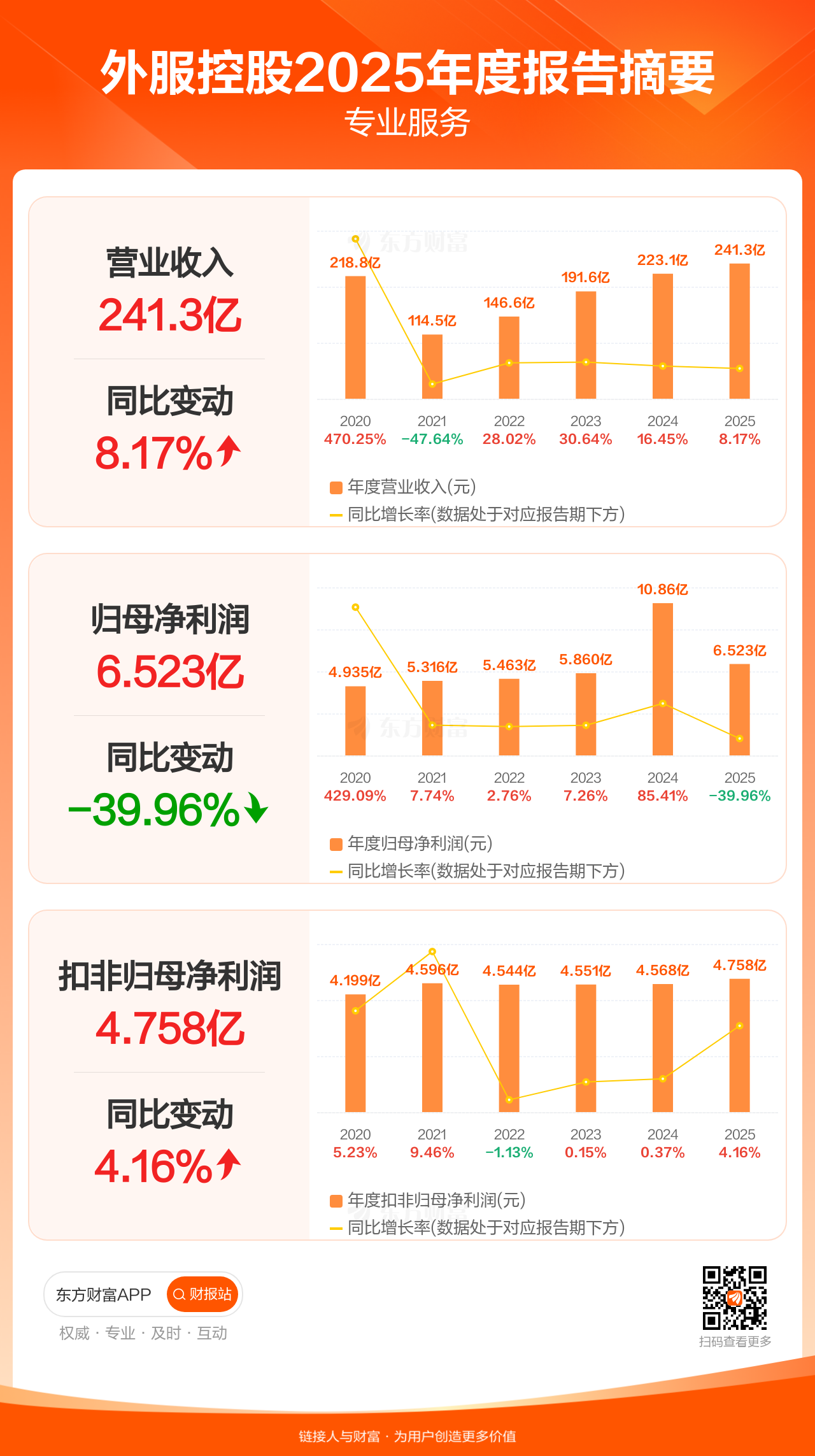 外服控股4月24日发布2025年年报显示,公司全年实现营业收入241.29亿元,同比增长8.17%;归母净利润6.52亿元,同比下滑39.96%;扣非归母净利润4.76亿元,同比增长4.16%。