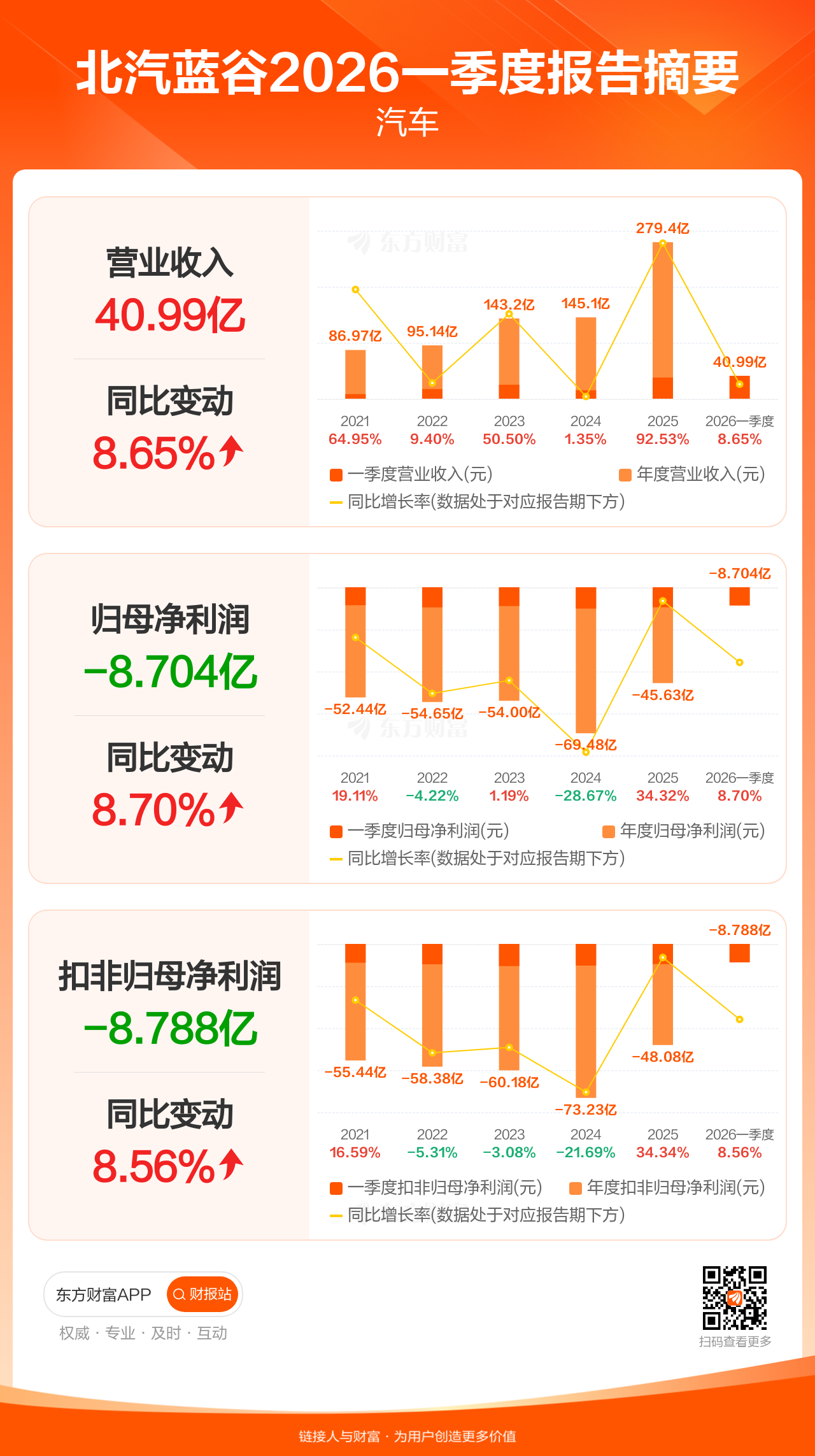 北汽蓝谷4月24日发布2026年一季报显示,公司一季度实现营业收入40.99亿元,同比增长8.65%;归母净利润-8.70亿元;扣非归母净利润-8.79亿元。