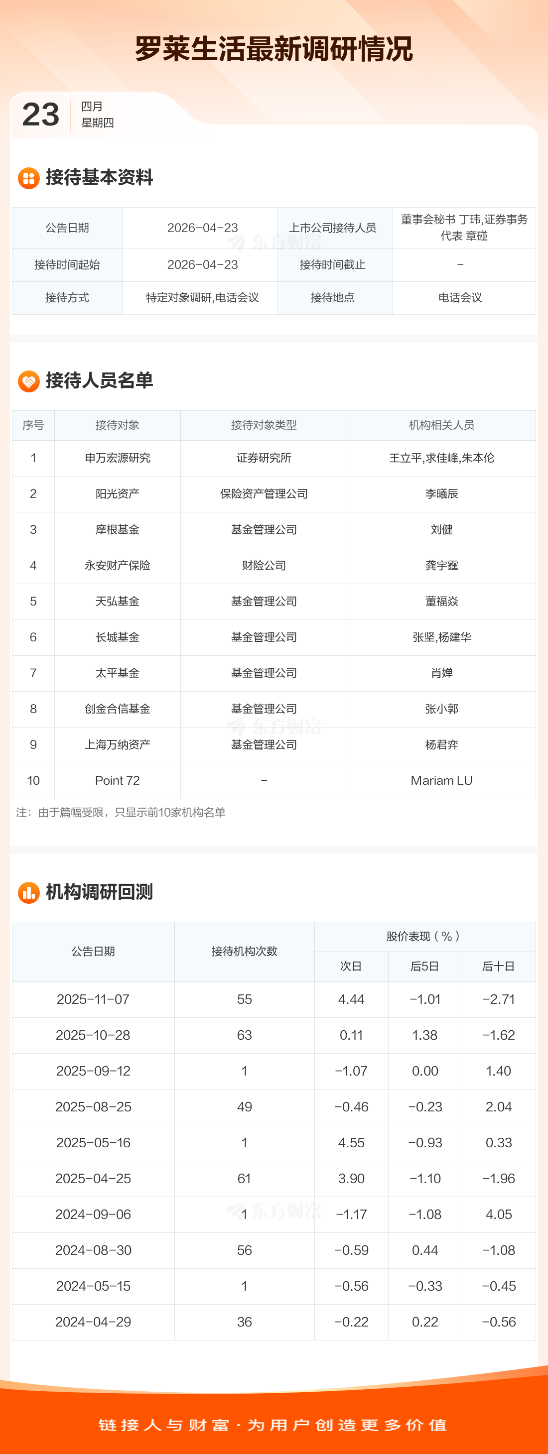 罗莱生活4月23日公告称,4月23日接待申万宏源研究等85家机构调研。接待人员包括董事会秘书 丁玮,证券事务代表 章碰。
