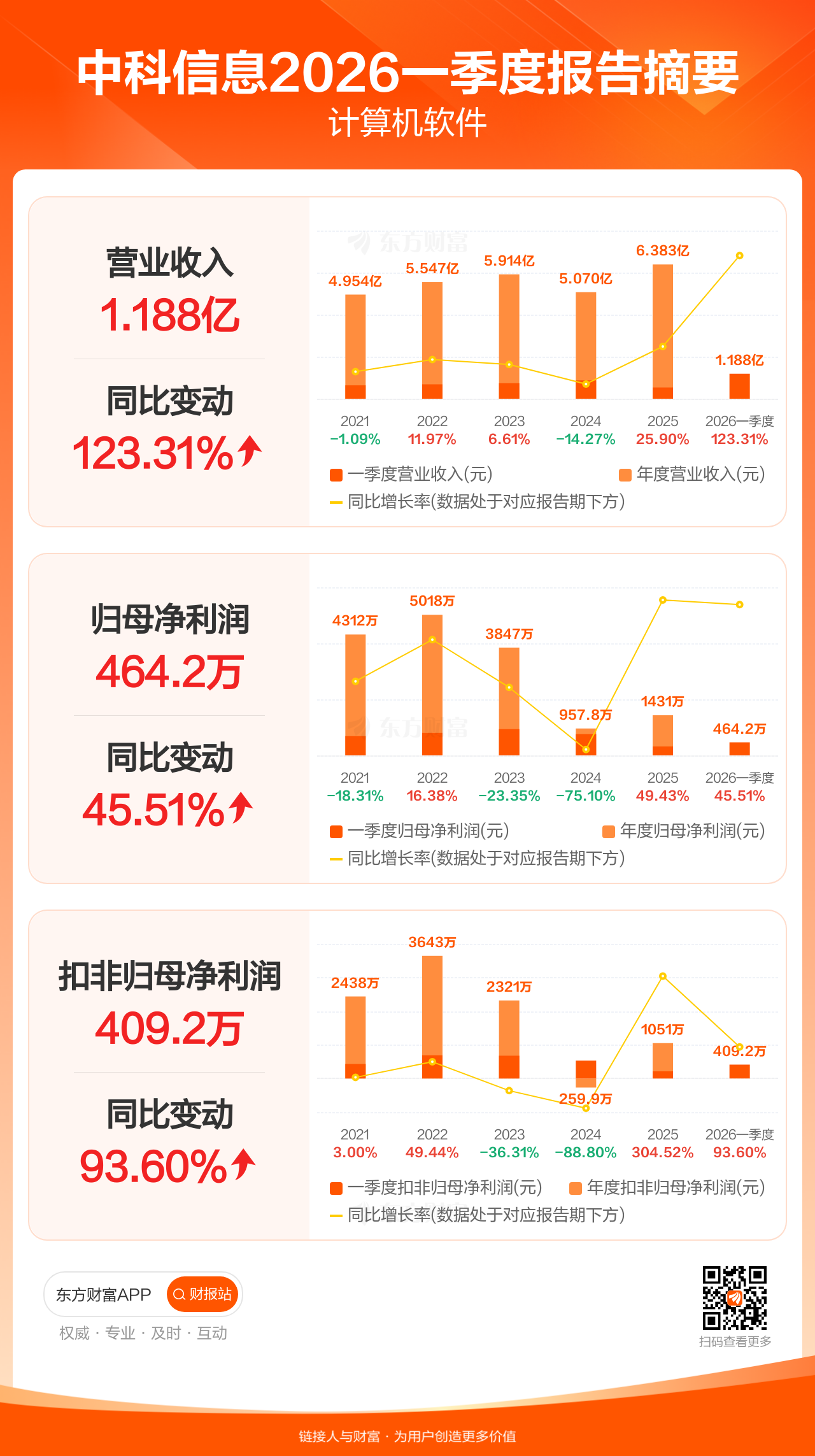 中科信息4月24日发布2026年一季报显示,公司一季度实现营业收入1.19亿元,同比增长123.31%;归母净利润464.19万元,同比增长45.51%;扣非归母净利润409.22万元,同比增长93.60%。